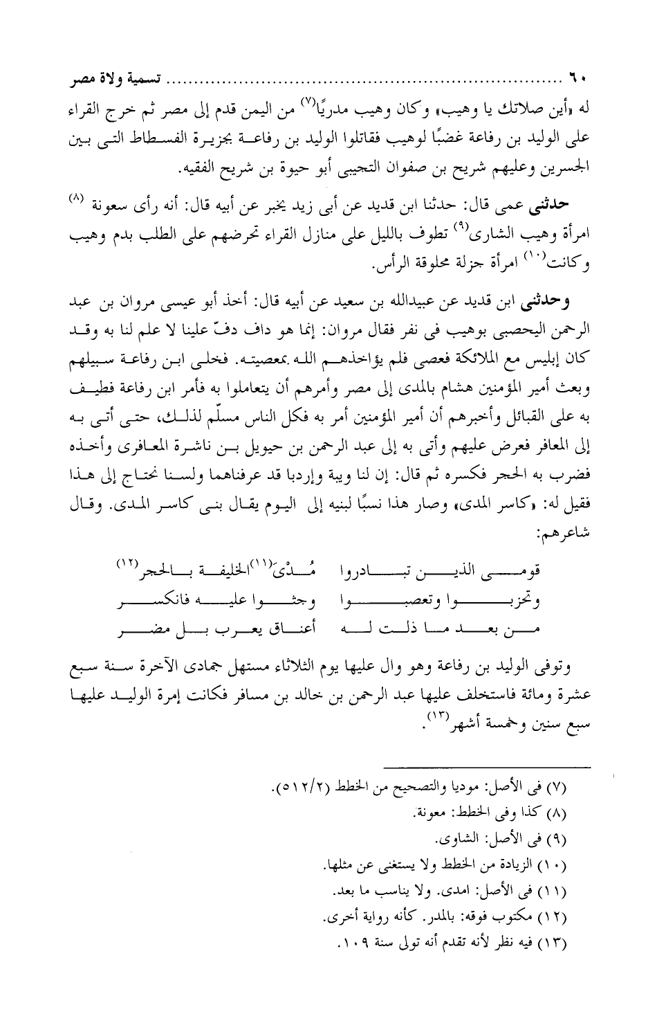 لَهُ: أَيْن صَلاتك يا وُهَيب، وكان وُهَيب مَدَرِيَّا من اليمَن قدِم إلى مِصر، ثمَّ خرج القُرَّاء عَلَى الوليد بْن رِفاعة غضبًا لوُهَيب، فقاتلوا الوليد بْن رِفاعة بجزيرة الفُسطاط التي بين الجِسرين، وعليهم شُريح بْن صَفْوان التُّجِيبيّ أَبُو حَيْوَة بن شُريح الفقيه