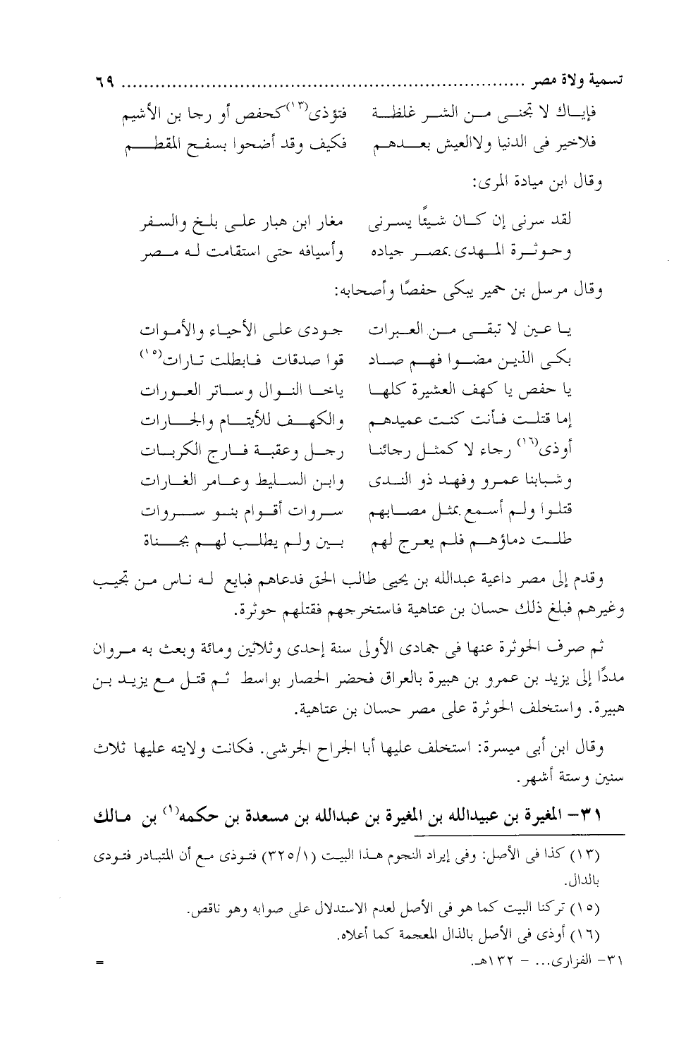 وحَوْثَرَةُ المُهدِي بِمصْرَ جِيَادَهُ ... وأسْيَافَهُ حَتَّى استَقَامَتْ لَهُ مِصرُ