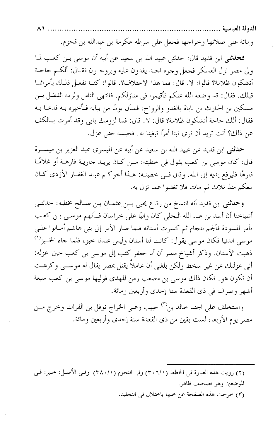 فحَدَّثَنِي ابن قُدَيد، قَالَ: حَدَّثَنِي عُبَيْد اللَّه بْن سَعِيد، عَنْ أبيه: أن مُوسَى بْن كَعْب لمَّا ولِيَ مِصر نزل العسكر فجعل وجوه الجُند يغدُون عَلَيْهِ ويروحون، فقال: " ألكم حاجة أتشكُون ظُلامة، قَالُوا: لا، قَالَ: فما هذا الاختلاف؟ قَالُوا: كنَّا نفعل ذَلكَ بأُمرائنا قبلك.