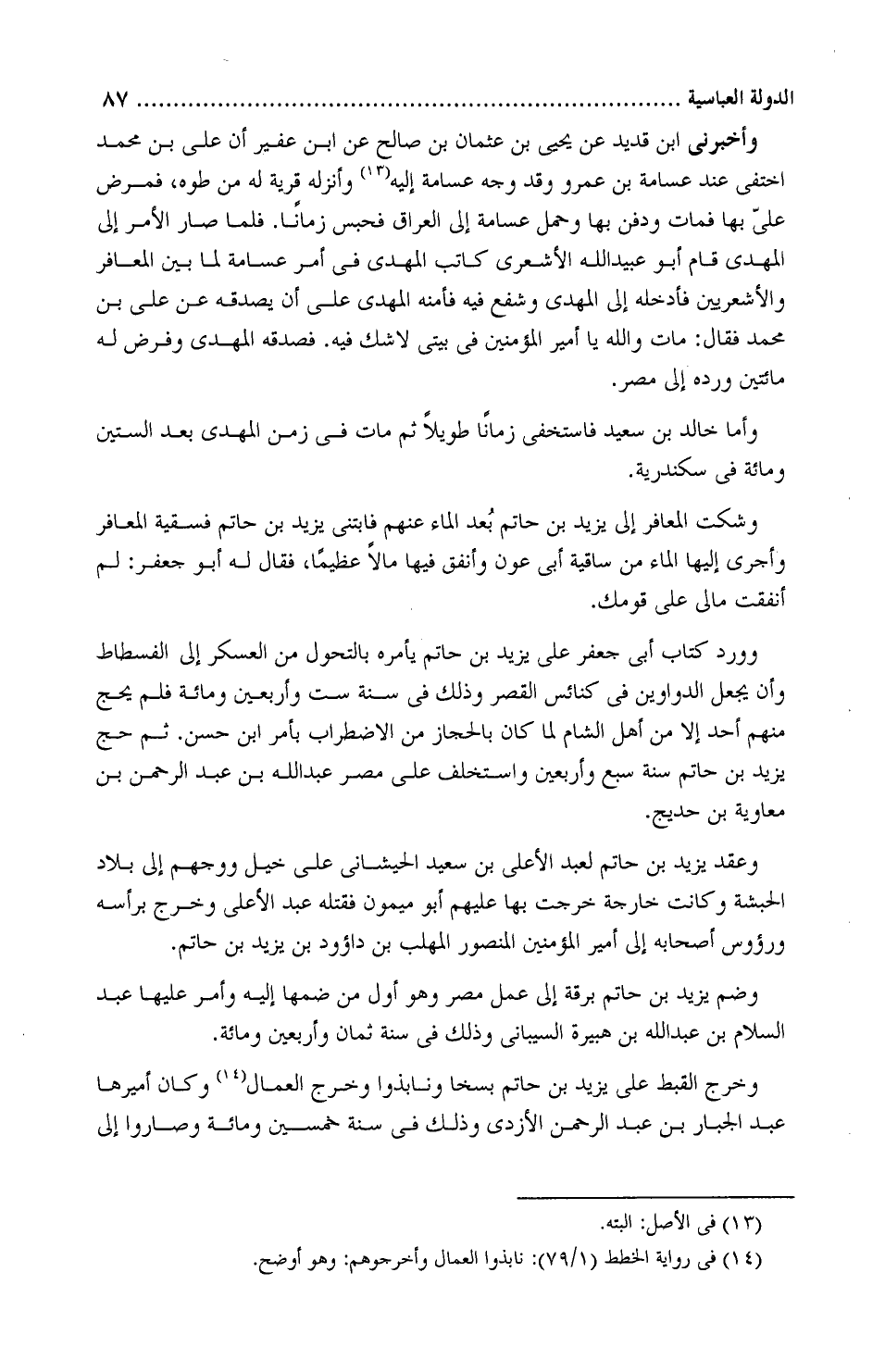 وأخبرني ابن قُدَيد، عَنْ يحيى بْن عُثمان بْن صالح، عَن ابن عُفير: " أن عليّ بْن محمد اختفى عند عسَّامة بْن عمرو، وقد وجَّه عَسَّامة إِلَيْهِ وأنزله قريةً لَهُ من طُوَّه، فمرِض عليّ بها، فمات ودُفن بها وحُمِل عَسَّامة إلى العراق، فحُبِس زمانًا، فلمَّا صار الأمرُ إلى المَهدِيّ قام أَبُو عُبَيْد اللَّه الأَشْعَريّ كاتب المهدِيّ فِي أمر عَسَّامة لِما بين المَعافر والأشعريّين، فأدخله إلى المَهدي وشفع فِيهِ، فأَمَّنه المَهديّ عَلَى أن يصدُقه عَنْ عليّ بْن محمد، فقال: مات والله يا أمير المؤمنين فِي بيتي لا شكَّ فِيهِ.