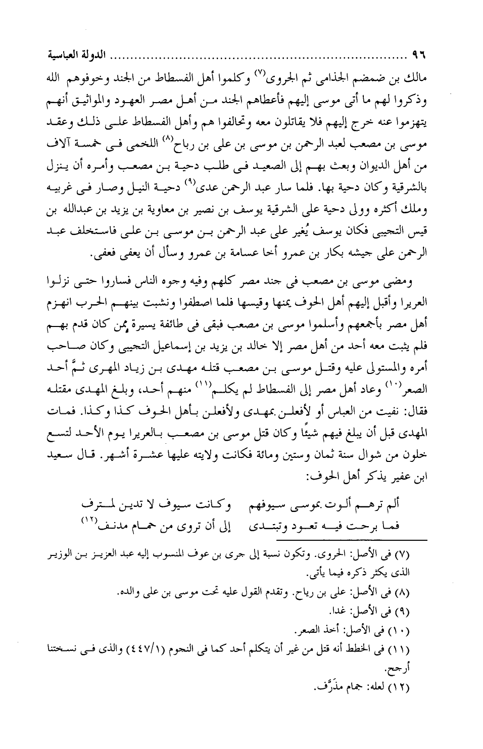 مالك بْن ضَمْضَم الجُذامي، ثم الجرويّ، وكلَّموا أهل الفُسطاط من الجُند، وخوَّفوهم اللَّه وذكروا لهم ما أتى مُوسَى إليهم، فأعطاهم الجُند من أهل مِصر العُهود والمواثيق أنهم ينهزموا عَنْهُ إذا خرج إليهم فلا يقابلون معه، وتحالفوا هُمْ وأهل الفُسطاط عَلَى ذَلكَ، وعقد مُوسَى بْن مُصعَب لعبد الرَّحْمَن بْن مُوسَى بْن عُلَيّ بْن ربَاح اللَخْميّ فِي خمسة آلاف من أهل الديوان، وبعث بهم إلى الصعيد فِي طلَب دِحْية بْن مُصْعَب، وأمره أن ينزل بالشرقيَّة وكان دِحْية بها، فلمَّا سار عبد الرحمن عدَّى دِحْية النيل وصار فِي غربيّة وملك كثره، وولَّى دِحْية عَلَى الشرقيَّة يوسف بْن نُصير بْن مُعاوية بْن يزيد بْن عبد الله بْن قيس التُّجِيبيّ، فكان يوسف يُغير عَلَى عبد الرحمن بْن مُوسَى بْن عُلَيّ، فاستخلف عبد الرَّحْمَن عَلَى جيشه بكَّار بْن عمرو أخا عَسَّامة بْن عمرو وسأَل أن يُعفَى، فعُفِي، ومضى مُوسَى بْن مُصْعَب فِي جُند مصر كلّهم وفيه وُجُوه الناس، فساروا حتى نزلوا العُريرا وأقبل إليهم أهل الخَوْف يَمنَها وقيسها، فلمَّا اصطفّوا ونَشِبتْ بينهم الحرب انهزم أهل مِصر بأجمعهم وأسلموا مُوسَى بْن مُصْعَب، فبقِيَ فِي طائفة يسيرة ممَّن كَانَ قدِم بهم فلم يثبت معه أحد من أهل مصر إلَّا خَالِد بْن يزيد بْن إسماعيل التُّجيبيّ، وكان صاحب أمره والمستولي عَلَيْهِ، وقُتل مُوسَى بْن مُصعَب قتَلَه مَهديّ بْن زياد المَهْريّ، ثمَّ أخذ الصعر، وعاد أهل مِصر إلى الفُسطاط لم يُكْلَم منهم أحَد وبلغ المَهدي مَقتله.