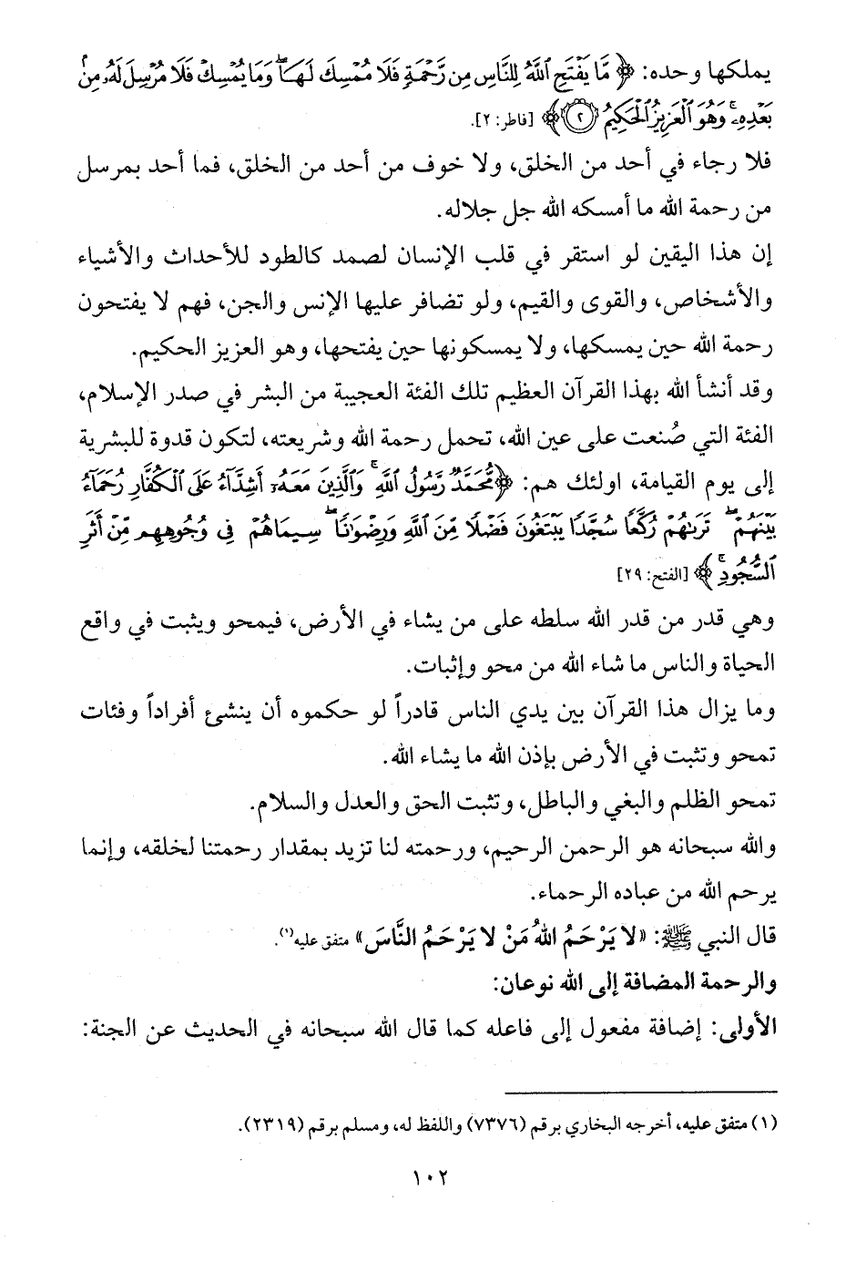 يملكها وحده: {مَا يَفْتَحِ اللَّهُ لِلنَّاسِ مِنْ رَحْمَةٍ فَلَا مُمْسِكَ لَهَا وَمَا يُمْسِكْ فَلَا مُرْسِلَ لَهُ مِنْ بَعْدِهِ وَهُوَ الْعَزِيزُ الْحَكِيمُ (2)} [فاطر: 2].