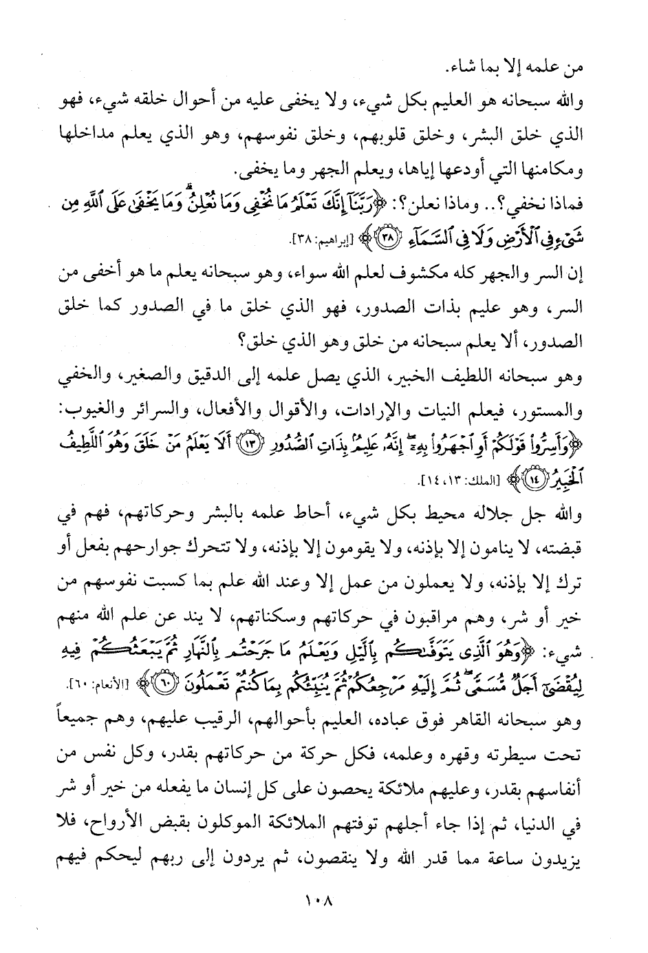 والله جل جلاله محيط بكل شيء، أحاط علمه بالبشر وحركاتهم، فهم في قبضته، لا ينامون إلا بإذنه، ولا يقومون إلا بإذنه، ولا تتحرك جوارحهم بفعل أو ترك إلا بإذنه، ولا يعملون من عمل إلا وعند الله علم بما كسبت نفوسهم من خير أو شر، وهم مراقبون في حركاتهم وسكناتهم، لا يند عن علم الله منهم شيء: {وَهُوَ الَّذِي يَتَوَفَّاكُمْ بِاللَّيْلِ وَيَعْلَمُ مَا جَرَحْتُمْ بِالنَّهَارِ ثُمَّ يَبْعَثُكُمْ فِيهِ لِيُقْضَى أَجَلٌ مُسَمًّى ثُمَّ إِلَيْهِ مَرْجِعُكُمْ ثُمَّ يُنَبِّئُكُمْ بِمَا كُنْتُمْ تَعْمَلُونَ (60)} ... [الأنعام: 60].