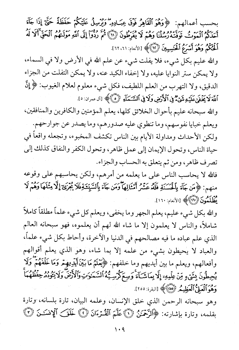 والله بكل شيء عليم، يعلم الجهر وما يخفى، ويعلم كل شيء علماً مطلقاً كاملاً شاملاً، والناس لا يعلمون إلا ما شاء الله لهم أن يعلموه، فهو سبحانه العالم الذي علم عباده ما فيه مصالحهم في الدنيا والآخرة، وأحاط بكل شيء علماً، والعباد لا يحيطون بشيء من علمه إلا بما شاء، وهو الذي يعلم أقوالهم وأفعالهم، ويعلم ما بين أيديهم وما خلفهم: {يَعْلَمُ مَا بَيْنَ أَيْدِيهِمْ وَمَا خَلْفَهُمْ وَلَا يُحِيطُونَ بِشَيْءٍ مِنْ عِلْمِهِ إِلَّا بِمَا شَاءَ وَسِعَ كُرْسِيُّهُ السَّمَاوَاتِ وَالْأَرْضَ وَلَا يَئُودُهُ حِفْظُهُمَا وَهُوَ الْعَلِيُّ الْعَظِيمُ (255)} [البقرة: 255].