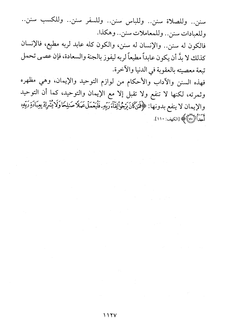 فهذه السنن والآداب والأحكام من لوازم التوحيد والإيمان، وهي مظهره وثمرته، لكنها لا تنفع ولا تقبل إلا مع الإيمان والتوحيد، كما أن التوحيد والإيمان لا ينفع بدونها: {فَمَنْ كَانَ يَرْجُو لِقَاءَ رَبِّهِ فَلْيَعْمَلْ عَمَلًا صَالِحًا وَلَا يُشْرِكْ بِعِبَادَةِ رَبِّهِ أَحَدًا (110)} [الكهف: 110].