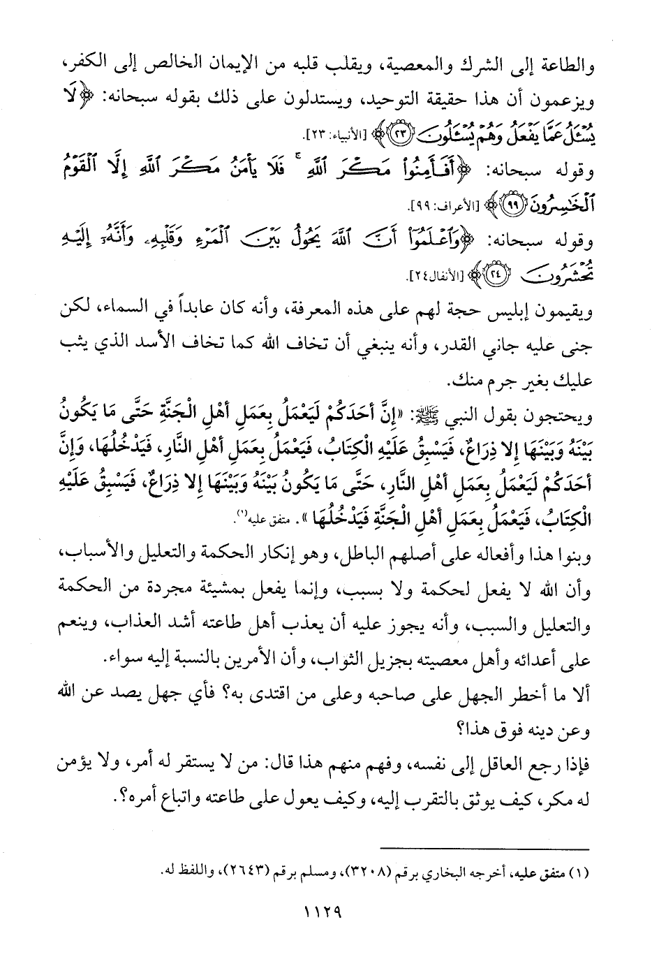 والطاعة إلى الشرك والمعصية، ويقلب قلبه من الإيمان الخالص إلى الكفر، ويزعمون أن هذا حقيقة التوحيد، ويستدلون على ذلك بقوله سبحانه: {لَا يُسْأَلُ عَمَّا يَفْعَلُ وَهُمْ يُسْأَلُونَ (23)} [الأنبياء: 23].