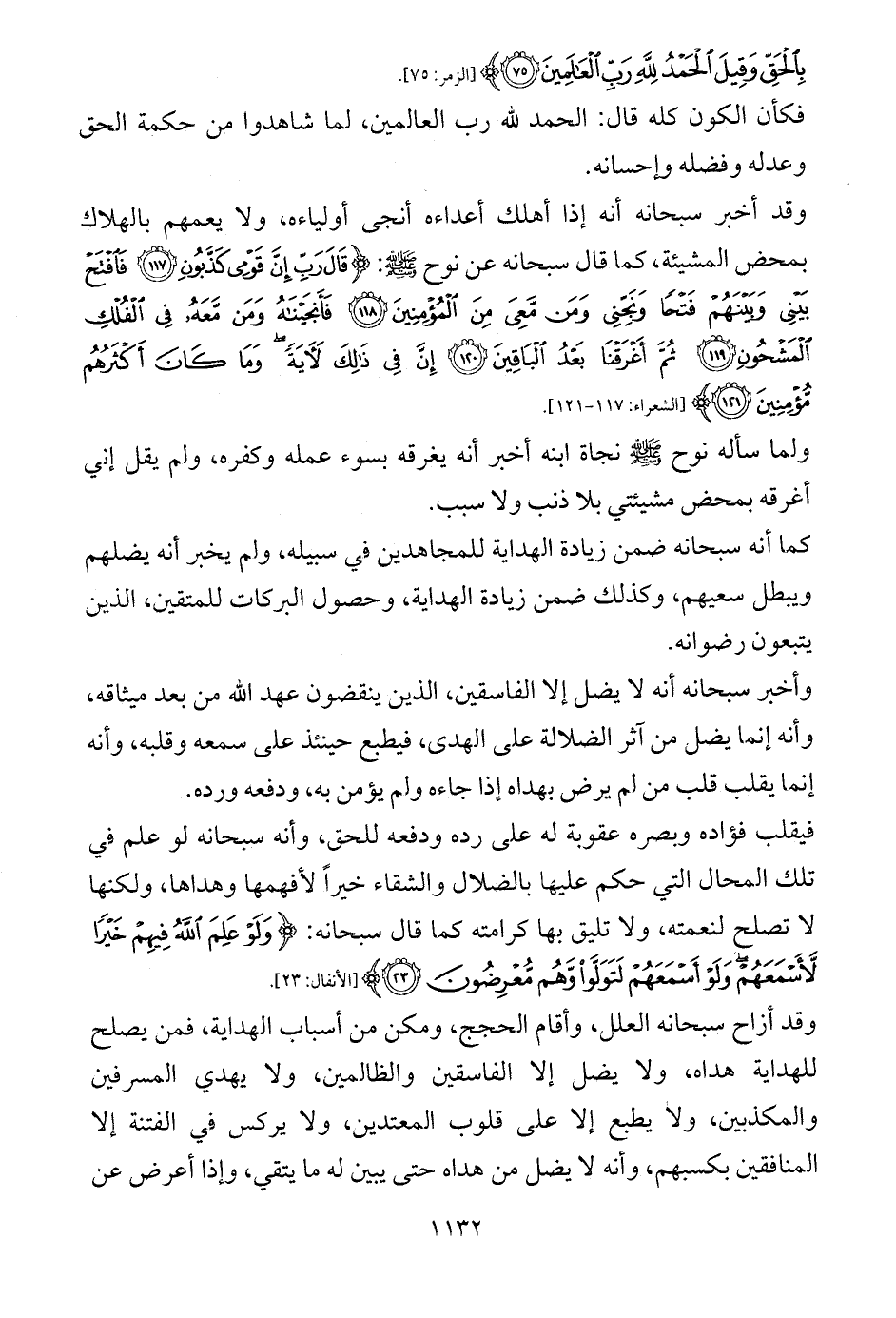 وقد أخبر سبحانه أنه إذا أهلك أعداءه أنجى أولياءه، ولا يعمهم بالهلاك بمحض المشيئة، كما قال سبحانه عن نوح - صلى الله عليه وسلم -: {قَالَ رَبِّ إِنَّ قَوْمِي كَذَّبُونِ (117) فَافْتَحْ بَيْنِي وَبَيْنَهُمْ فَتْحًا وَنَجِّنِي وَمَنْ مَعِيَ مِنَ الْمُؤْمِنِينَ (118) فَأَنْجَيْنَاهُ وَمَنْ مَعَهُ فِي الْفُلْكِ الْمَشْحُونِ (119) ثُمَّ أَغْرَقْنَا بَعْدُ الْبَاقِينَ (120) إِنَّ فِي ذَلِكَ لَآيَةً وَمَا كَانَ أَكْثَرُهُمْ مُؤْمِنِينَ (121)} [الشعراء: 117 - 121].