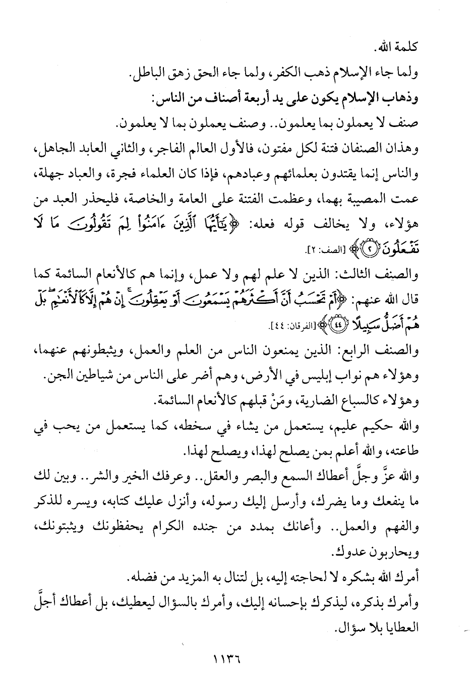والصنف الثالث: الذين لا علم لهم ولا عمل، وإنما هم كالأنعام السائمة كما قال الله عنهم: {أَمْ تَحْسَبُ أَنَّ أَكْثَرَهُمْ يَسْمَعُونَ أَوْ يَعْقِلُونَ إِنْ هُمْ إِلَّا كَالْأَنْعَامِ بَلْ هُمْ أَضَلُّ سَبِيلًا (44)} [الفرقان: 44].