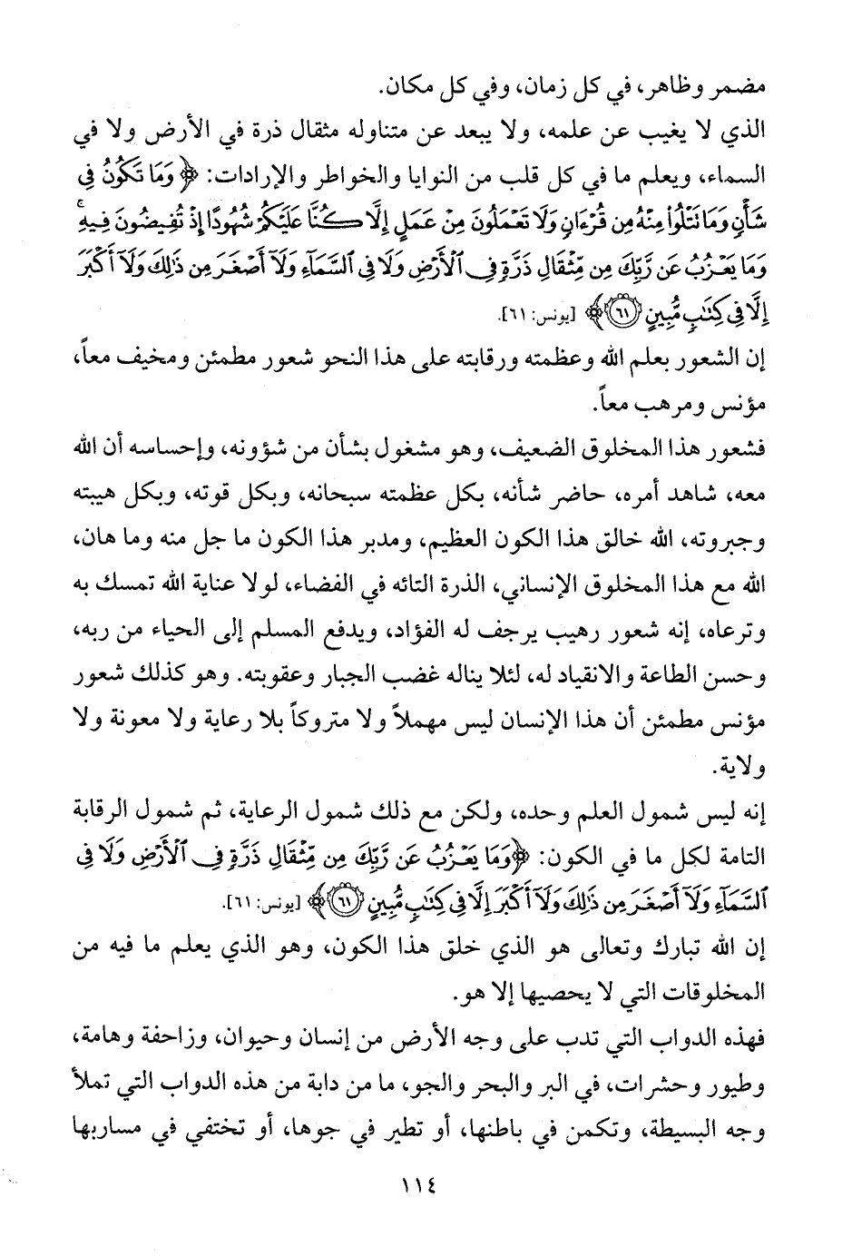 إنه ليس شمول العلم وحده، ولكن مع ذلك شمول الرعاية، ثم شمول الرقابة التامة لكل ما في الكون: {وَمَا يَعْزُبُ عَنْ رَبِّكَ مِنْ مِثْقَالِ ذَرَّةٍ فِي الْأَرْضِ وَلَا فِي السَّمَاءِ وَلَا أَصْغَرَ مِنْ ذَلِكَ وَلَا أَكْبَرَ إِلَّا فِي كِتَابٍ مُبِينٍ (61)} [يونس: 61].