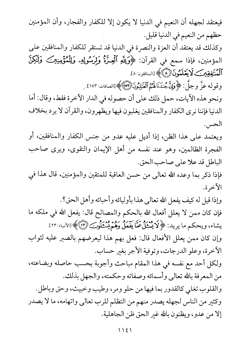 وكذلك قد يعتقد أن العزة والنصرة في الدنيا قد تستقر للكفار والمنافقين على المؤمنين، فإذا سمع في القرآن: {وَلِلَّهِ الْعِزَّةُ وَلِرَسُولِهِ وَلِلْمُؤْمِنِينَ وَلَكِنَّ الْمُنَافِقِينَ لَا يَعْلَمُونَ (8)} [المنافقون: 8].