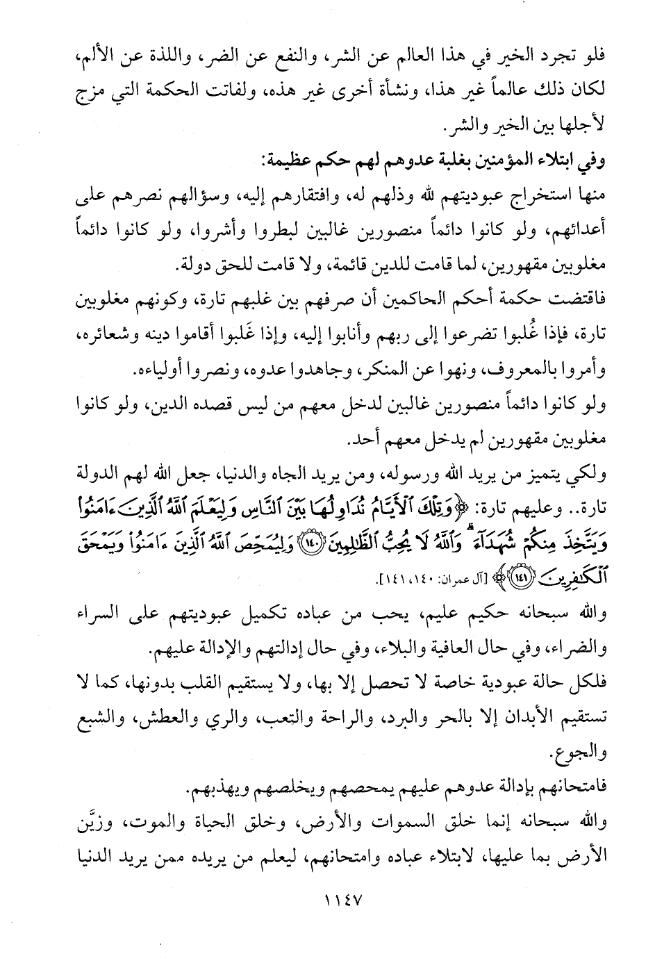فاقتضت حكمة أحكم الحاكمين أن صرفهم بين غلبهم تارة، وكونهم مغلوبين تارة، فإذا غُلبوا تضرعوا إلى ربهم وأنابوا إليه، وإذا غَلبوا أقاموا دينه وشعائره، وأمروا بالمعروف، ونهوا عن المنكر، وجاهدوا عدوه، ونصروا أولياءه.