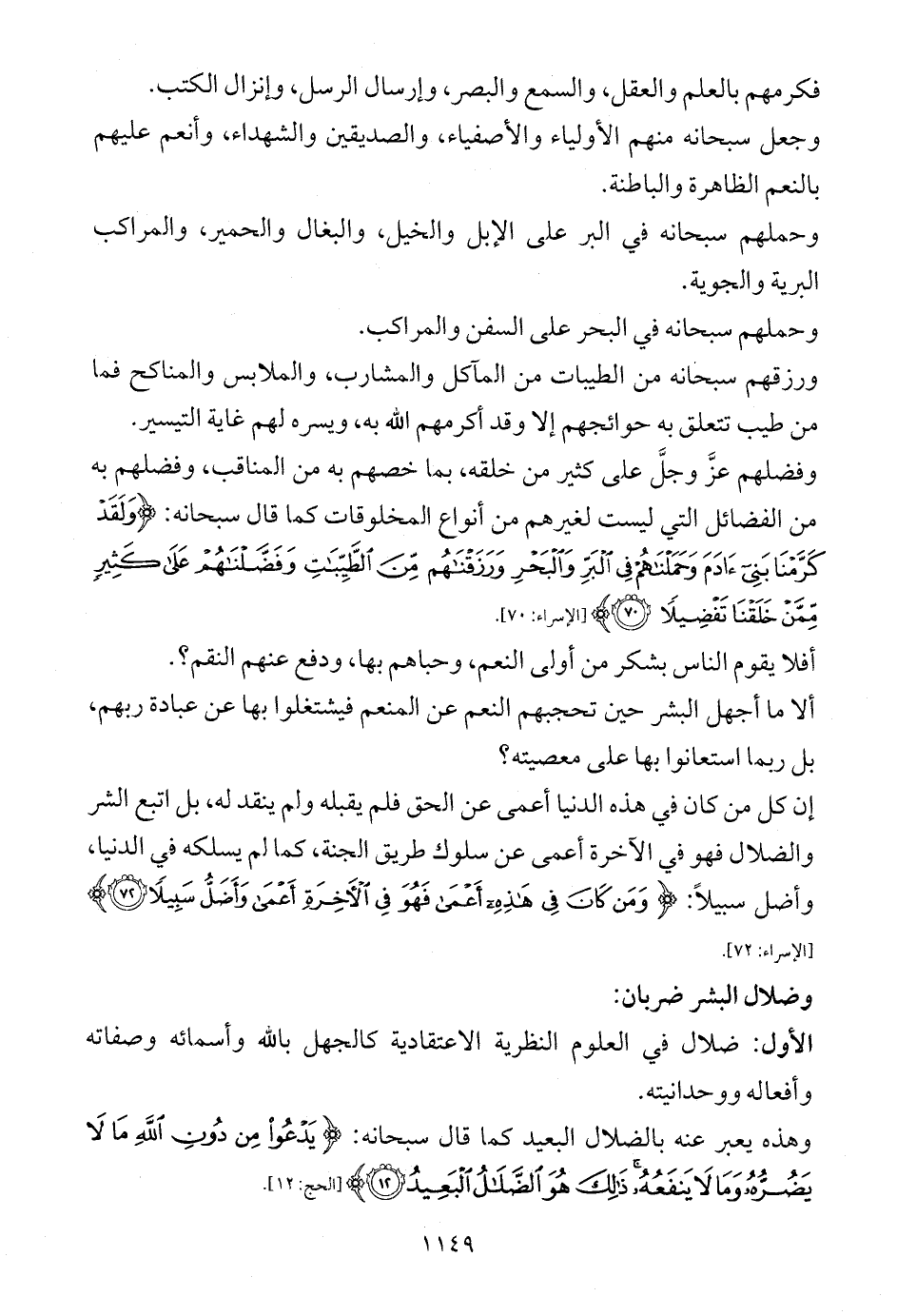 وفضلهم عزَّ وجلَّ على كثير من خلقه، بما خصهم به من المناقب، وفضلهم به من الفضائل التي ليست لغيرهم من أنواع المخلوقات كما قال سبحانه: {وَلَقَدْ كَرَّمْنَا بَنِي آدَمَ وَحَمَلْنَاهُمْ فِي الْبَرِّ وَالْبَحْرِ وَرَزَقْنَاهُمْ مِنَ الطَّيِّبَاتِ وَفَضَّلْنَاهُمْ عَلَى كَثِيرٍ مِمَّنْ خَلَقْنَا تَفْضِيلًا (70)} [الإسراء: 70].