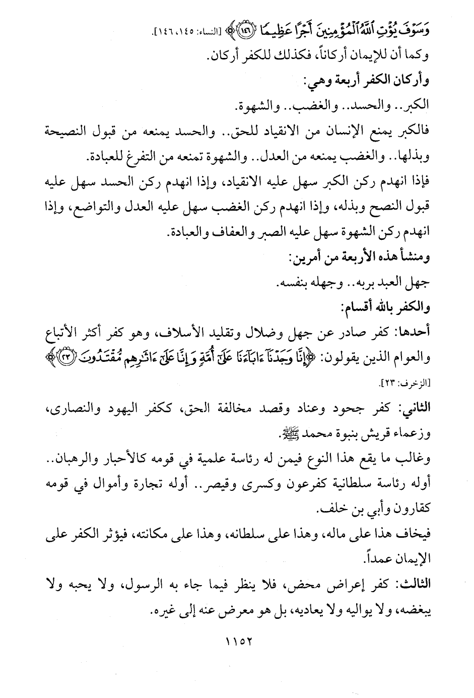 أحدها: كفر صادر عن جهل وضلال وتقليد الأسلاف، وهو كفر أكثر الأتباع والعوام الذين يقولون: {إِنَّا وَجَدْنَا آبَاءَنَا عَلَى أُمَّةٍ وَإِنَّا عَلَى آثَارِهِمْ مُقْتَدُونَ (23)} [الزخرف: 23].