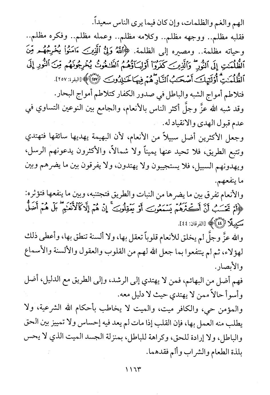 وقد شبه الله عزَّ وجلَّ أكثر الناس بالأنعام، والجامع بين النوعين التساوي في عدم قبول الهدى والانقياد له.