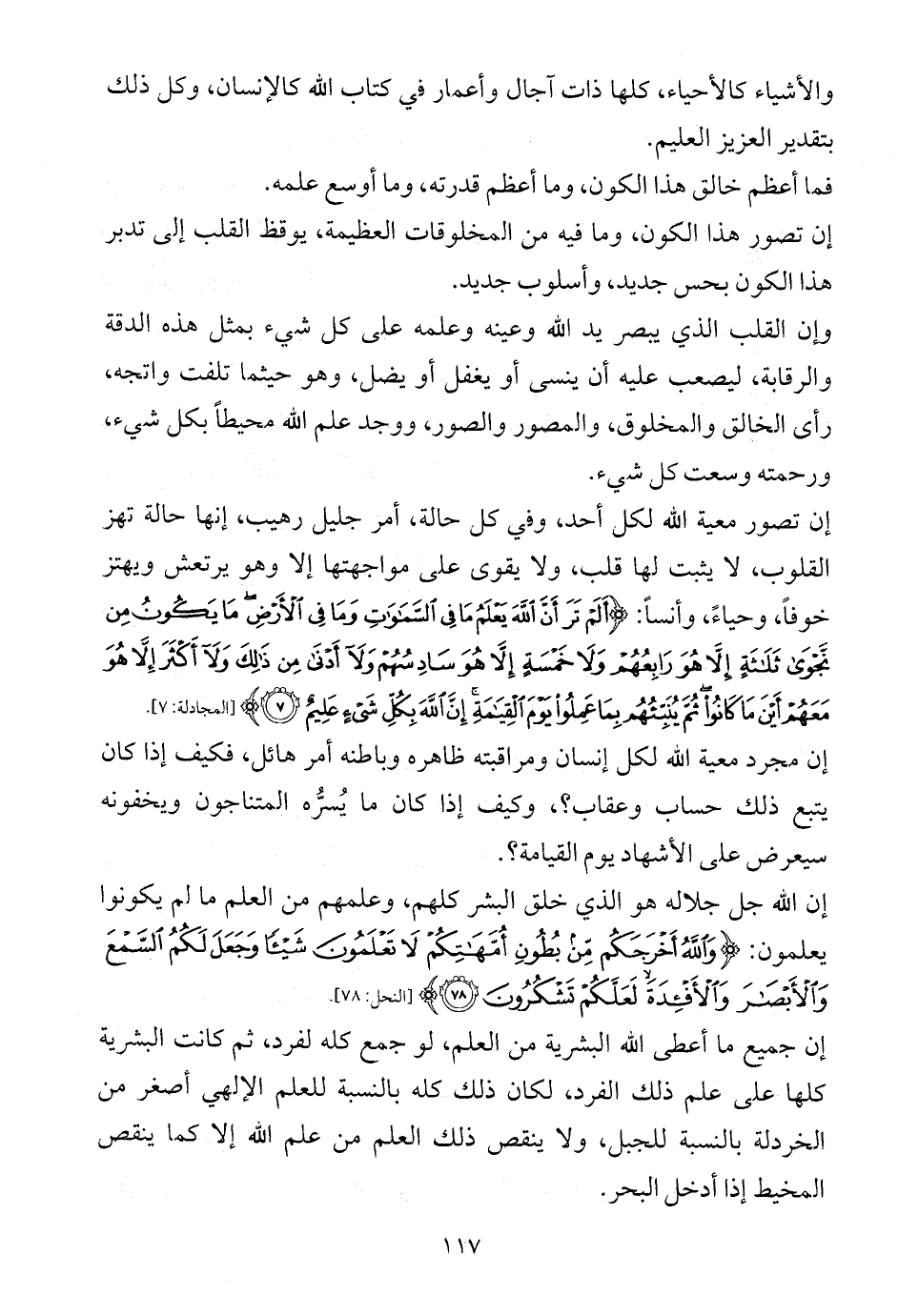 وإن القلب الذي يبصر يد الله وعينه وعلمه على كل شيء بمثل هذه الدقة والرقابة، ليصعب عليه أن ينسى أو يغفل أو يضل، وهو حيثما تلفت واتجه، رأى الخالق والمخلوق، والمصور والصور، ووجد علم الله محيطاً بكل شيء، ورحمته وسعت كل شيء.
