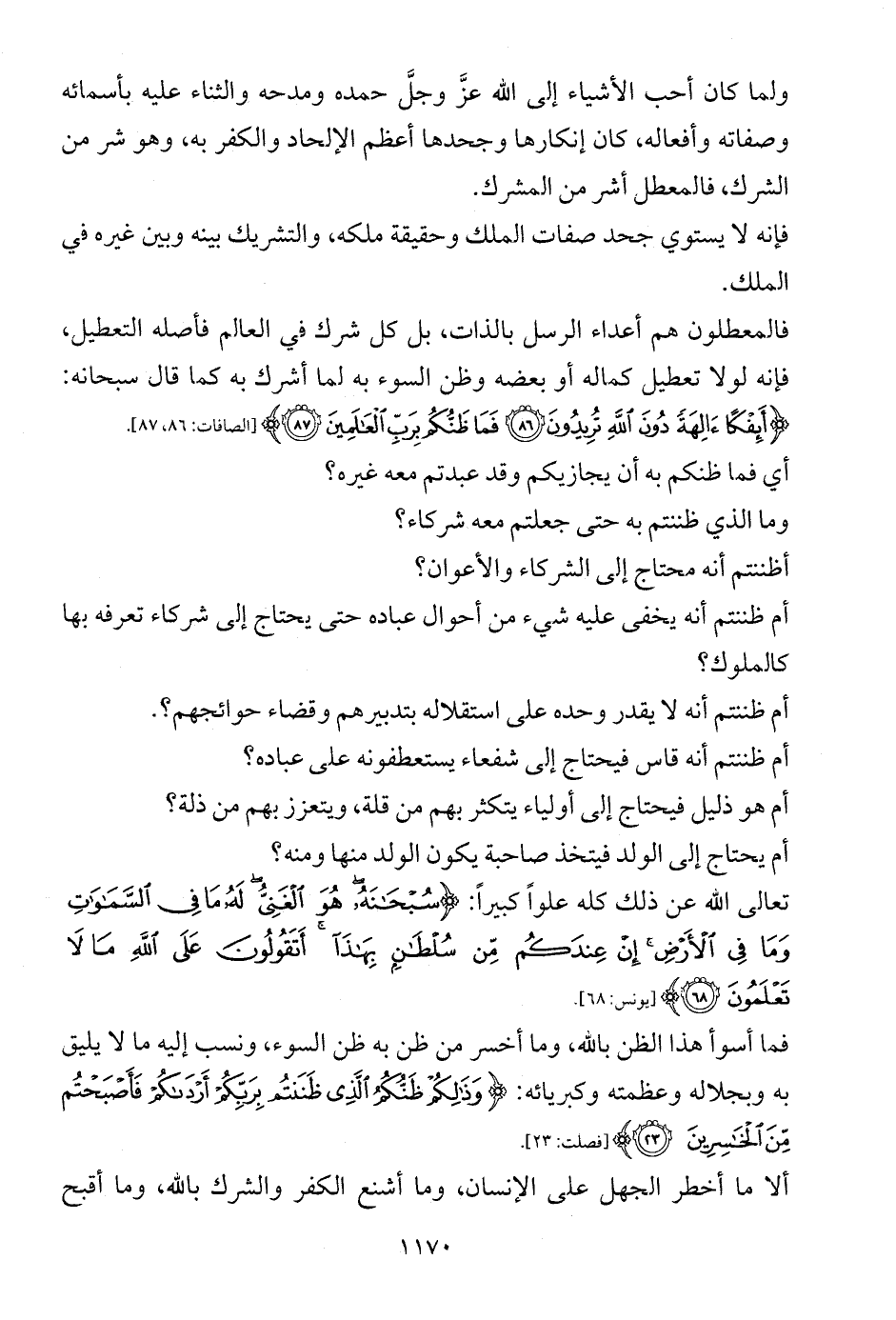 ولما كان أحب الأشياء إلى الله عزَّ وجلَّ حمده ومدحه والثناء عليه بأسمائه وصفاته وأفعاله، كان إنكارها وجحدها أعظم الإلحاد والكفر به، وهو شر من الشرك، فالمعطل أشر من المشرك.