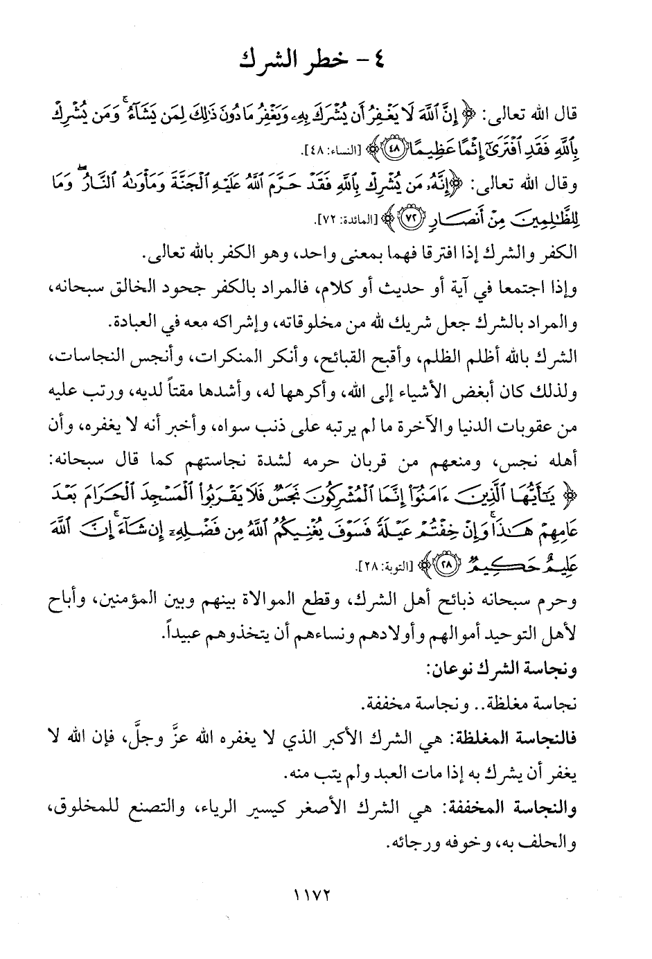 الشرك بالله أظلم الظلم، وأقبح القبائح، وأنكر المنكرات، وأنجس النجاسات، ولذلك كان أبغض الأشياء إلى الله، وأكرهها له، وأشدها مقتاً لديه، ورتب عليه من عقوبات الدنيا والآخرة ما لم يرتبه على ذنب سواه، وأخبر أنه لا يغفره، وأن أهله نجس، ومنعهم من قربان حرمه لشدة نجاستهم كما قال سبحانه: {يَاأَيُّهَا الَّذِينَ آمَنُوا إِنَّمَا الْمُشْرِكُونَ نَجَسٌ فَلَا يَقْرَبُوا الْمَسْجِدَ الْحَرَامَ بَعْدَ عَامِهِمْ هَذَا وَإِنْ خِفْتُمْ عَيْلَةً فَسَوْفَ يُغْنِيكُمُ اللَّهُ مِنْ فَضْلِهِ إِنْ شَاءَ إِنَّ اللَّهَ عَلِيمٌ حَكِيمٌ (28)} [التوبة: 28].