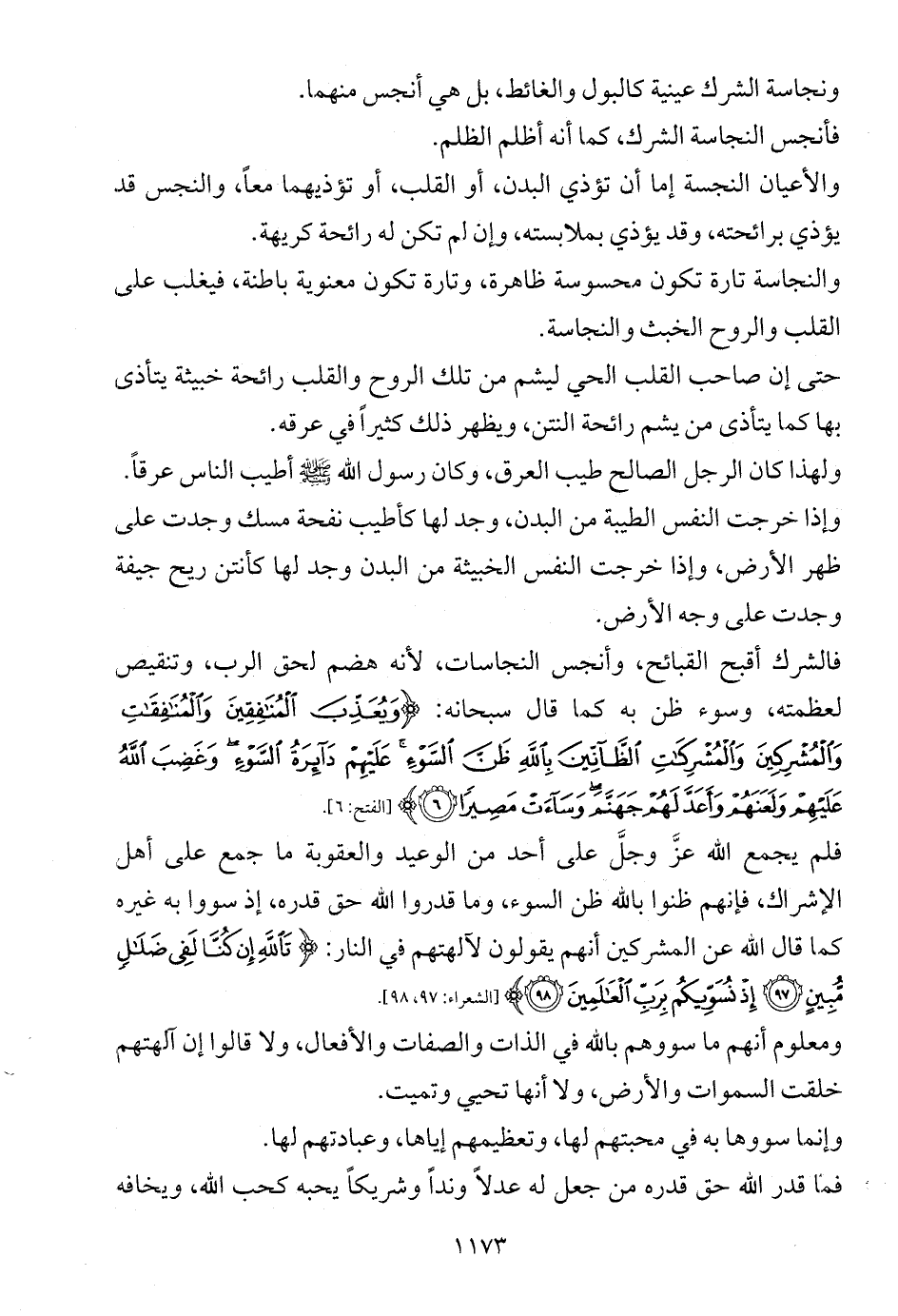 فالشرك أقبح القبائح، وأنجس النجاسات، لأنه هضم لحق الرب، وتنقيص لعظمته، وسوء ظن به كما قال سبحانه: {وَيُعَذِّبَ الْمُنَافِقِينَ وَالْمُنَافِقَاتِ وَالْمُشْرِكِينَ وَالْمُشْرِكَاتِ الظَّانِّينَ بِاللَّهِ ظَنَّ السَّوْءِ عَلَيْهِمْ دَائِرَةُ السَّوْءِ وَغَضِبَ اللَّهُ عَلَيْهِمْ وَلَعَنَهُمْ وَأَعَدَّ لَهُمْ جَهَنَّمَ وَسَاءَتْ مَصِيرًا (6)} [الفتح: 6].