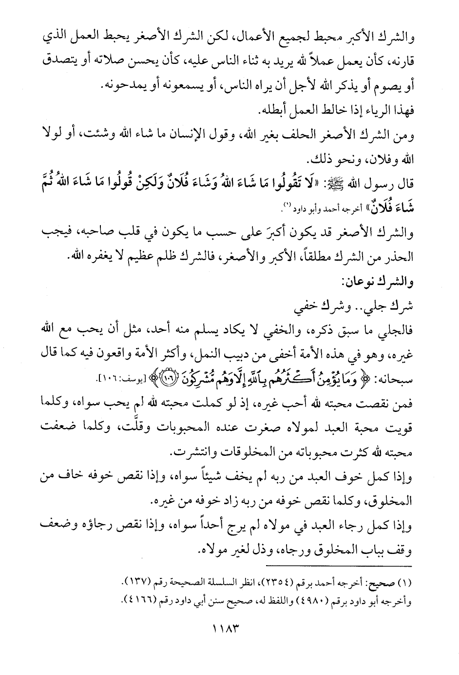 فالجلي ما سبق ذكره، والخفي لا يكاد يسلم منه أحد، مثل أن يحب مع الله غيره، وهو في هذه الأمة أخفى من دبيب النمل، وأكثر الأمة واقعون فيه كما قال سبحانه: {وَمَا يُؤْمِنُ أَكْثَرُهُمْ بِاللَّهِ إِلَّا وَهُمْ مُشْرِكُونَ (106)} [يوسف: 106].