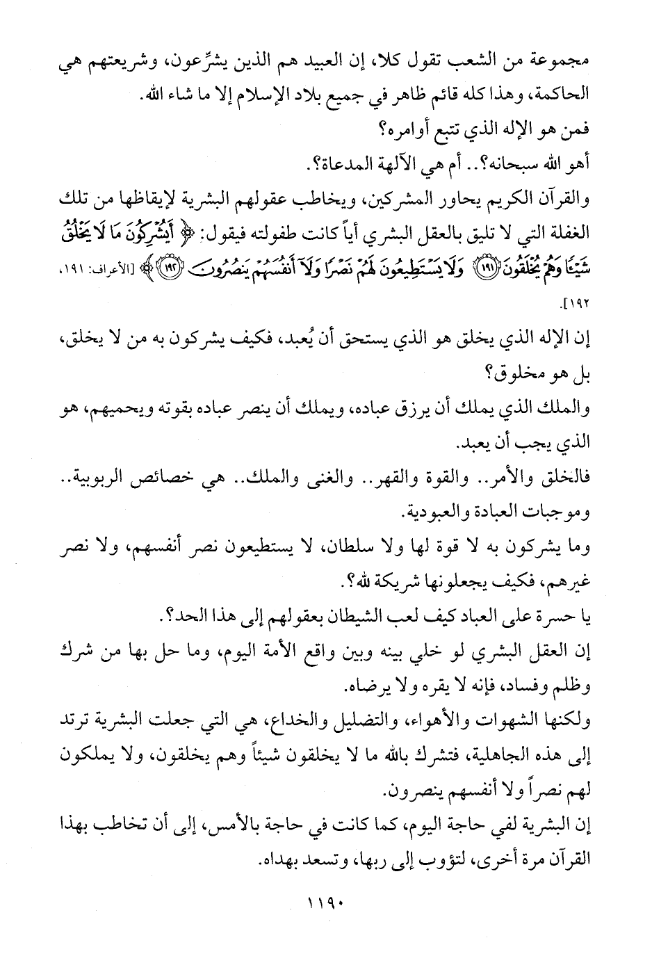 مجموعة من الشعب تقول كلا، إن العبيد هم الذين يشرِّعون، وشريعتهم هي الحاكمة، وهذا كله قائم ظاهر في جميع بلاد الإسلام إلا ما شاء الله.