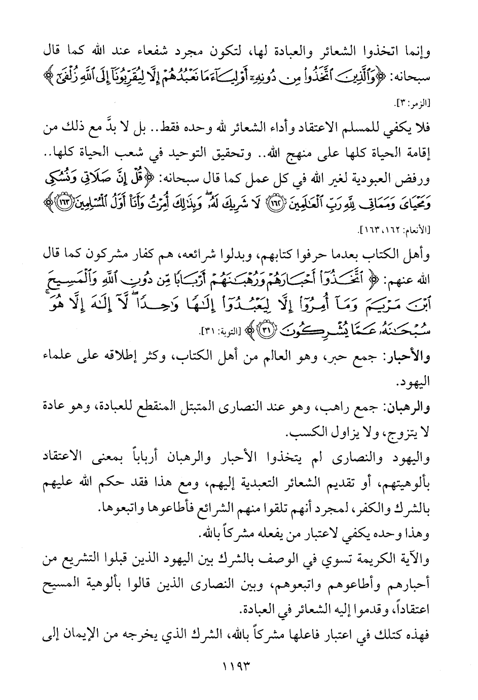 واليهود والنصارى لم يتخذوا الأحبار والرهبان أرباباً بمعنى الاعتقاد بألوهيتهم، أو تقديم الشعائر التعبدية إليهم، ومع هذا فقد حكم الله عليهم بالشرك والكفر، لمجرد أنهم تلقوا منهم الشرائع فأطاعوها واتبعوها.