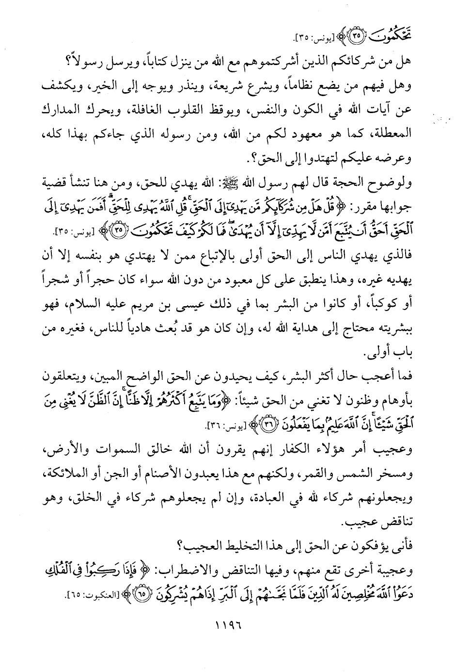 ولوضوح الحجة قال لهم رسول الله - صلى الله عليه وسلم -: الله يهدي للحق، ومن هنا تنشأ قضية جوابها مقرر: {قُلْ هَلْ مِنْ شُرَكَائِكُمْ مَنْ يَهْدِي إِلَى الْحَقِّ قُلِ اللَّهُ يَهْدِي لِلْحَقِّ أَفَمَنْ يَهْدِي إِلَى الْحَقِّ أَحَقُّ أَنْ يُتَّبَعَ أَمَّنْ لَا يَهِدِّي إِلَّا أَنْ يُهْدَى فَمَا لَكُمْ كَيْفَ تَحْكُمُونَ (35)} [يونس: 35].