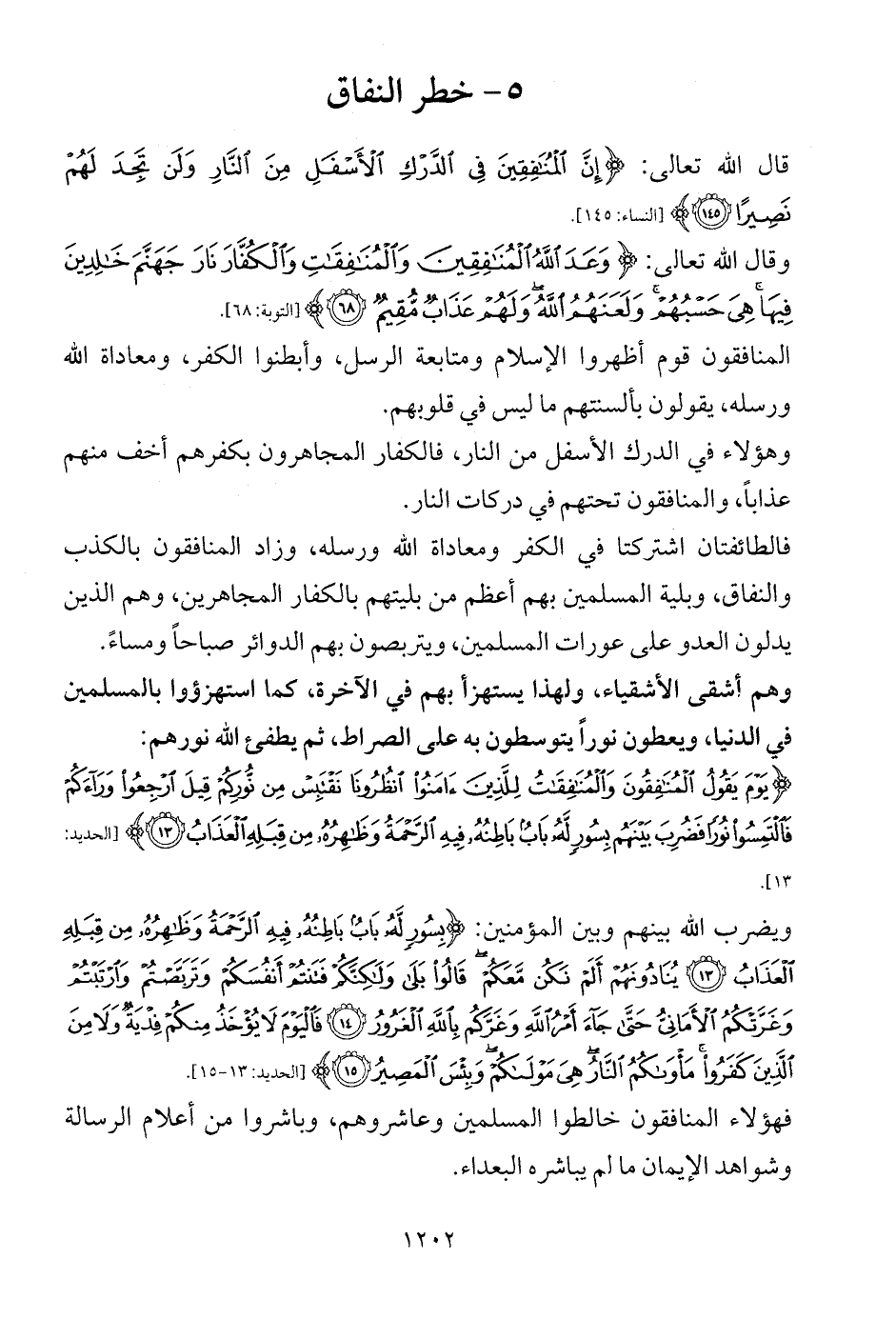 فالطائفتان اشتركتا في الكفر ومعاداة الله ورسله، وزاد المنافقون بالكذب والنفاق، وبلية المسلمين بهم أعظم من بليتهم بالكفار المجاهرين، وهم الذين يدلون العدو على عورات المسلمين، ويتربصون بهم الدوائر صباحاً ومساءً.