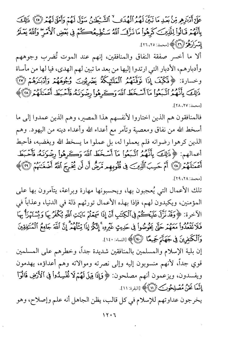 ألا ما أخسر صفقة النفاق والمنافقين، إنهم عند الموت تُضرب وجوههم وأدبارهم، الأدبار التي ارتدوا إليها من بعد ما تبين لهم الهدى، فيا لها من مأساة وخسارة: {فَكَيْفَ إِذَا تَوَفَّتْهُمُ الْمَلَائِكَةُ يَضْرِبُونَ وُجُوهَهُمْ وَأَدْبَارَهُمْ (27) ذَلِكَ بِأَنَّهُمُ اتَّبَعُوا مَا أَسْخَطَ اللَّهَ وَكَرِهُوا رِضْوَانَهُ فَأَحْبَطَ أَعْمَالَهُمْ (28)} [محمد: 27، 28].