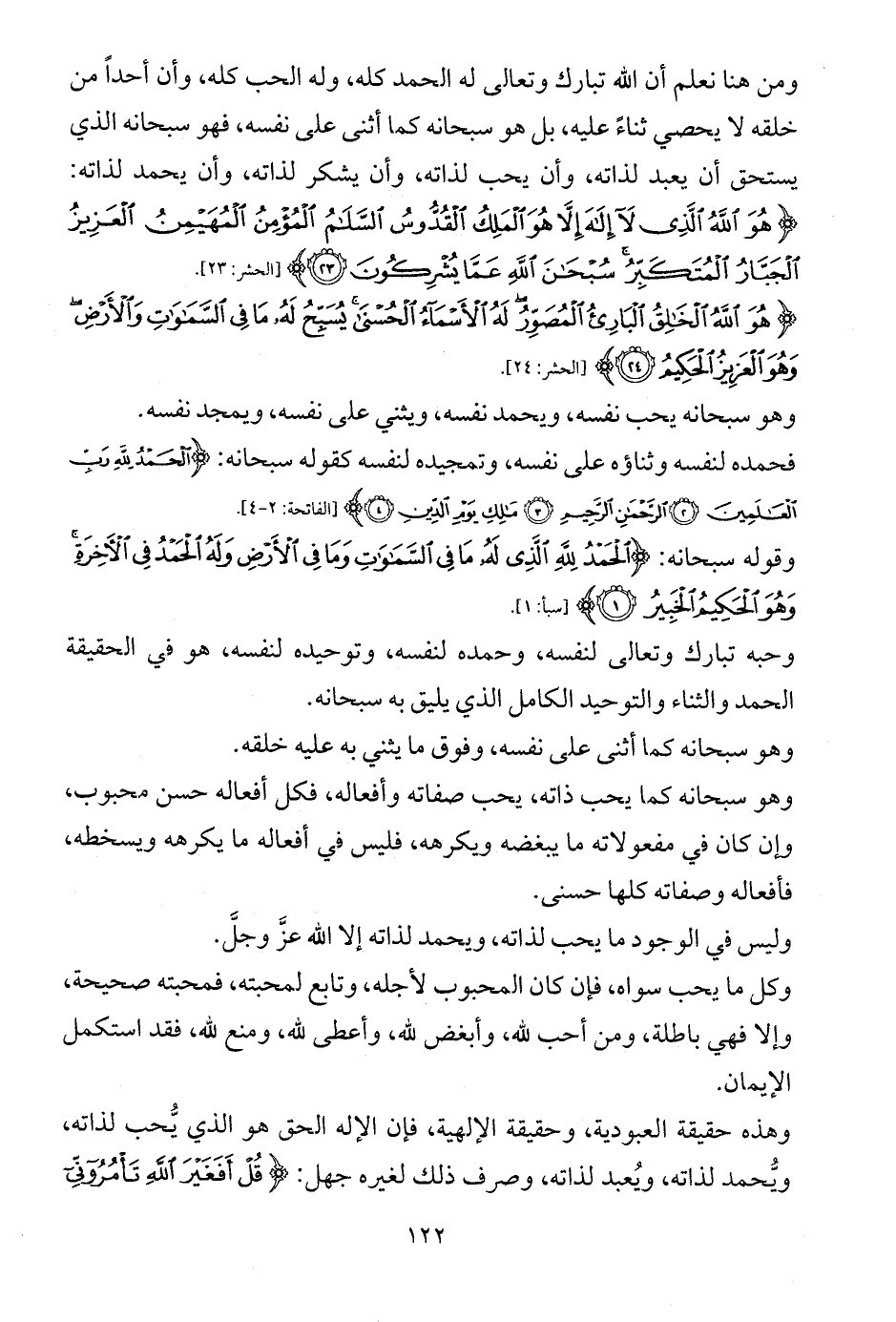 ومن هنا نعلم أن الله تبارك وتعالى له الحمد كله، وله الحب كله، وأن أحداً من خلقه لا يحصي ثناءً عليه، بل هو سبحانه كما أثنى على نفسه، فهو سبحانه الذي يستحق أن يعبد لذاته، وأن يحب لذاته، وأن يشكر لذاته، وأن يحمد لذاته: {هُوَ اللَّهُ الَّذِي لَا إِلَهَ إِلَّا هُوَ الْمَلِكُ الْقُدُّوسُ السَّلَامُ الْمُؤْمِنُ الْمُهَيْمِنُ الْعَزِيزُ الْجَبَّارُ الْمُتَكَبِّرُ سُبْحَانَ اللَّهِ عَمَّا يُشْرِكُونَ (23)} [الحشر: 23].