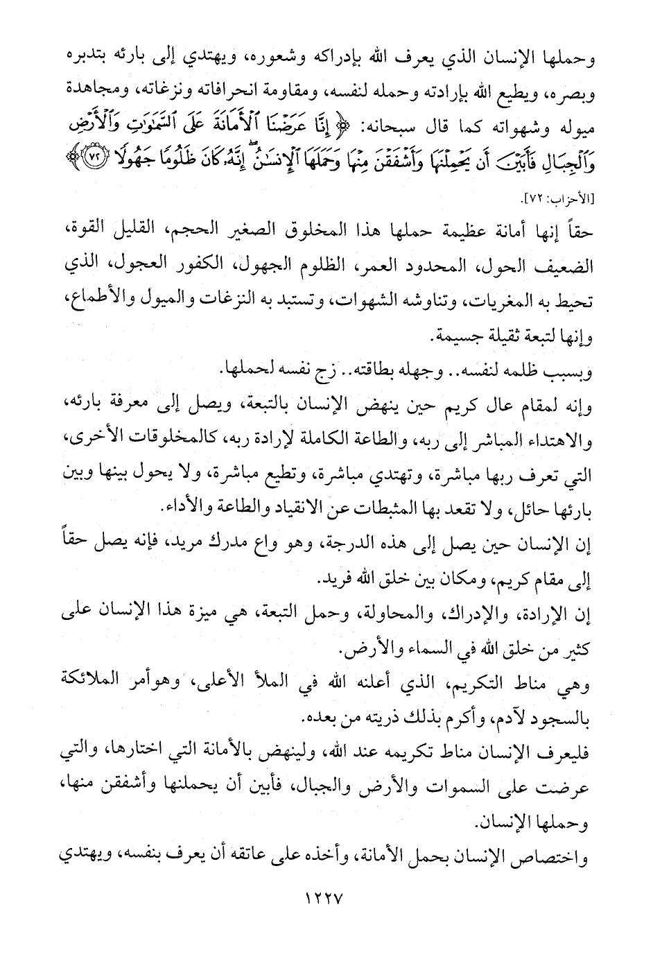 وحملها الإنسان الذي يعرف الله بإدراكه وشعوره، ويهتدي إلى بارئه بتدبره وبصره، ويطيع الله بإرادته وحمله لنفسه، ومقاومة انحرافاته ونزغاته، ومجاهدة ميوله وشهواته كما قال سبحانه: {إِنَّا عَرَضْنَا الْأَمَانَةَ عَلَى السَّمَاوَاتِ وَالْأَرْضِ وَالْجِبَالِ فَأَبَيْنَ أَنْ يَحْمِلْنَهَا وَأَشْفَقْنَ مِنْهَا وَحَمَلَهَا الْإِنْسَانُ إِنَّهُ كَانَ ظَلُومًا جَهُولًا (72)} [الأحزاب: 72].