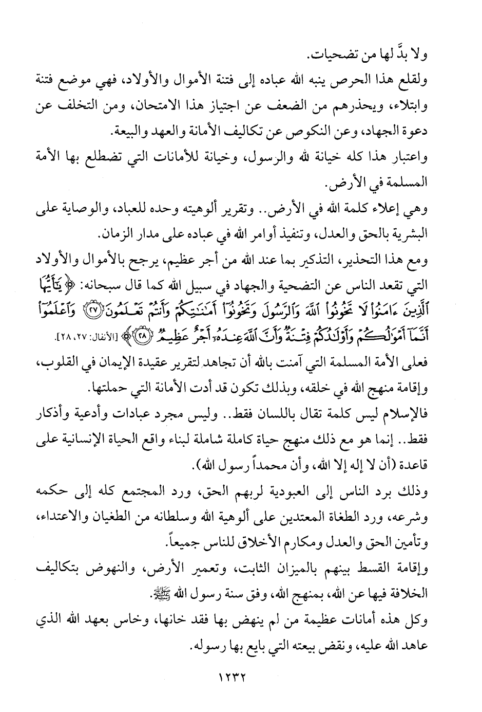 فعلى الأمة المسلمة التي آمنت بالله أن تجاهد لتقرير عقيدة الإيمان في القلوب، وإقامة منهج الله في خلقه، وبذلك تكون قد أدت الأمانة التي حملتها.