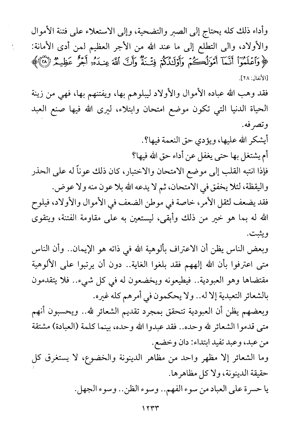 وأداء ذلك كله يحتاج إلى الصبر والتضحية، وإلى الاستعلاء على فتنة الأموال والأولاد، والى التطلع إلى ما عند الله من الأجر العظيم لمن أدى الأمانة: {وَاعْلَمُوا أَنَّمَا أَمْوَالُكُمْ وَأَوْلَادُكُمْ فِتْنَةٌ وَأَنَّ اللَّهَ عِنْدَهُ أَجْرٌ عَظِيمٌ (28)} [الأنفال: 28].
