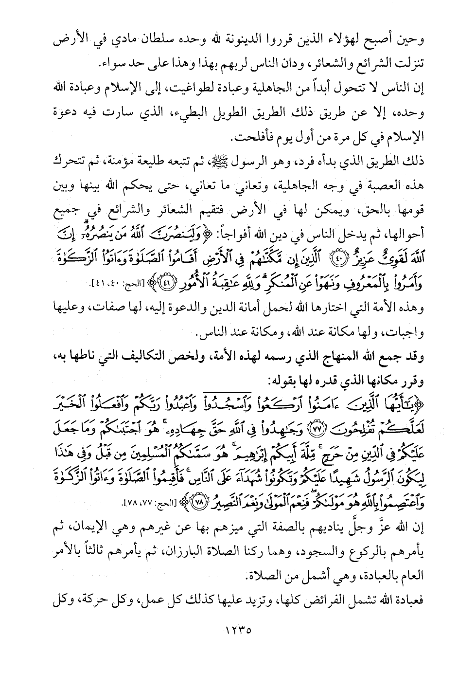 {يَاأَيُّهَا الَّذِينَ آمَنُوا ارْكَعُوا وَاسْجُدُوا وَاعْبُدُوا رَبَّكُمْ وَافْعَلُوا الْخَيْرَ لَعَلَّكُمْ تُفْلِحُونَ (77) وَجَاهِدُوا فِي اللَّهِ حَقَّ جِهَادِهِ هُوَ اجْتَبَاكُمْ وَمَا جَعَلَ عَلَيْكُمْ فِي الدِّينِ مِنْ حَرَجٍ مِلَّةَ أَبِيكُمْ إِبْرَاهِيمَ هُوَ سَمَّاكُمُ الْمُسْلِمِينَ مِنْ قَبْلُ وَفِي هَذَا لِيَكُونَ الرَّسُولُ شَهِيدًا عَلَيْكُمْ وَتَكُونُوا شُهَدَاءَ عَلَى النَّاسِ فَأَقِيمُوا الصَّلَاةَ وَآتُوا الزَّكَاةَ وَاعْتَصِمُوا بِاللَّهِ هُوَ مَوْلَاكُمْ فَنِعْمَ الْمَوْلَى وَنِعْمَ النَّصِيرُ (78)} [الحج: 77، 78].