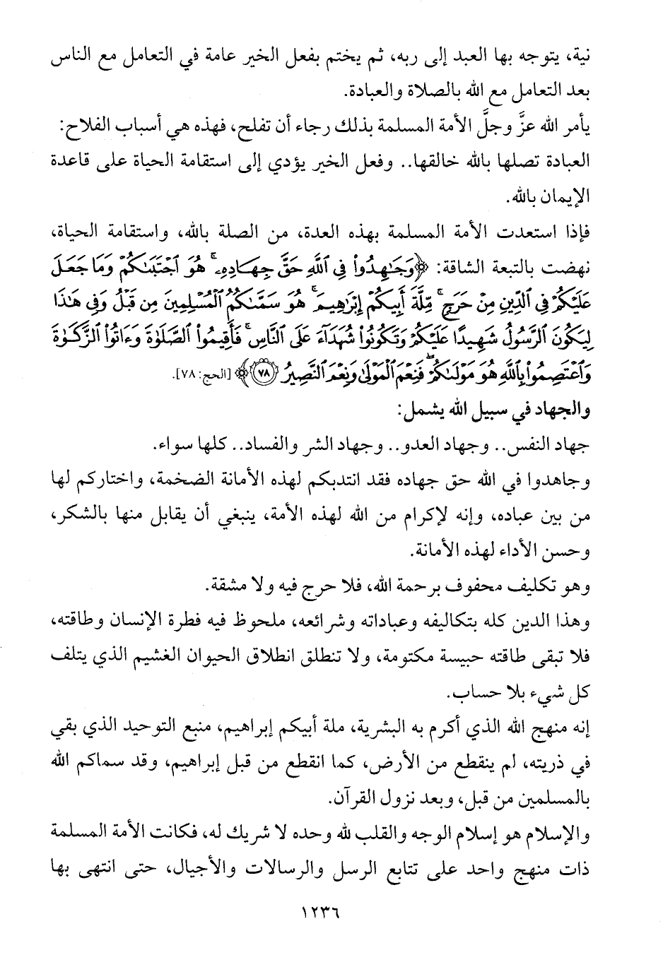 وجاهدوا في الله حق جهاده فقد انتدبكم لهذه الأمانة الضخمة، واختاركم لها من بين عباده، وإنه لإكرام من الله لهذه الأمة، ينبغي أن يقابل منها بالشكر، وحسن الأداء لهذه الأمانة.