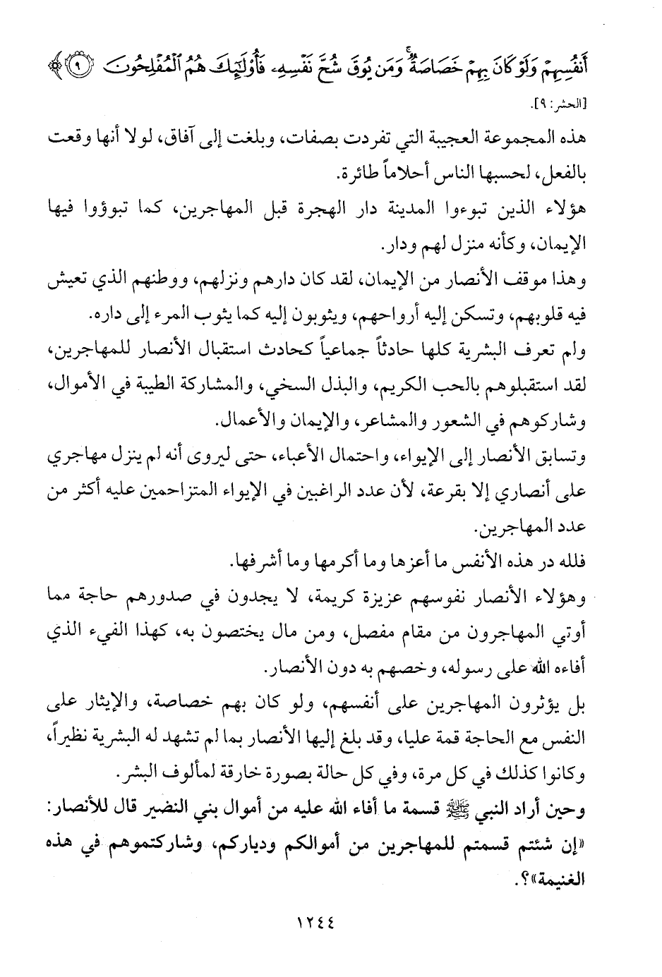 أَنْفُسِهِمْ وَلَوْ كَانَ بِهِمْ خَصَاصَةٌ وَمَنْ يُوقَ شُحَّ نَفْسِهِ فَأُولَئِكَ هُمُ الْمُفْلِحُونَ (9)} [الحشر: 9].