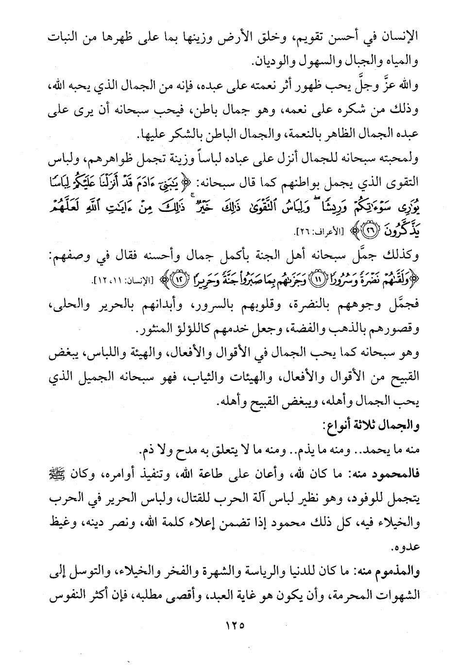 وهو سبحانه كما يحب الجمال في الأقوال والأفعال، والهيئة واللباس، يبغض القبيح من الأقوال والأفعال، والهيئات والثياب، فهو سبحانه الجميل الذي يحب الجمال وأهله، ويبغض القبيح وأهله.