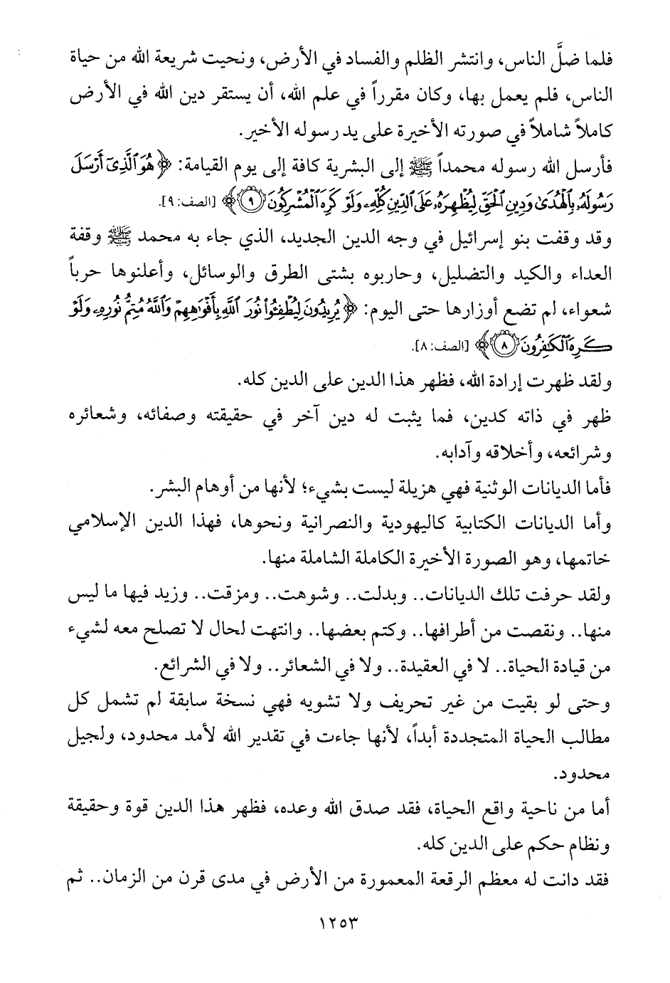 ولقد حرفت تلك الديانات .. وبدلت .. وشوهت .. ومزقت .. وزيد فيها ما ليس منها .. ونقصت من أطرافها .. وكتم بعضها .. وانتهت لحال لا تصلح معه لشيء من قيادة الحياة .. لا في العقيدة .. ولا في الشعائر .. ولا في الشرائع.