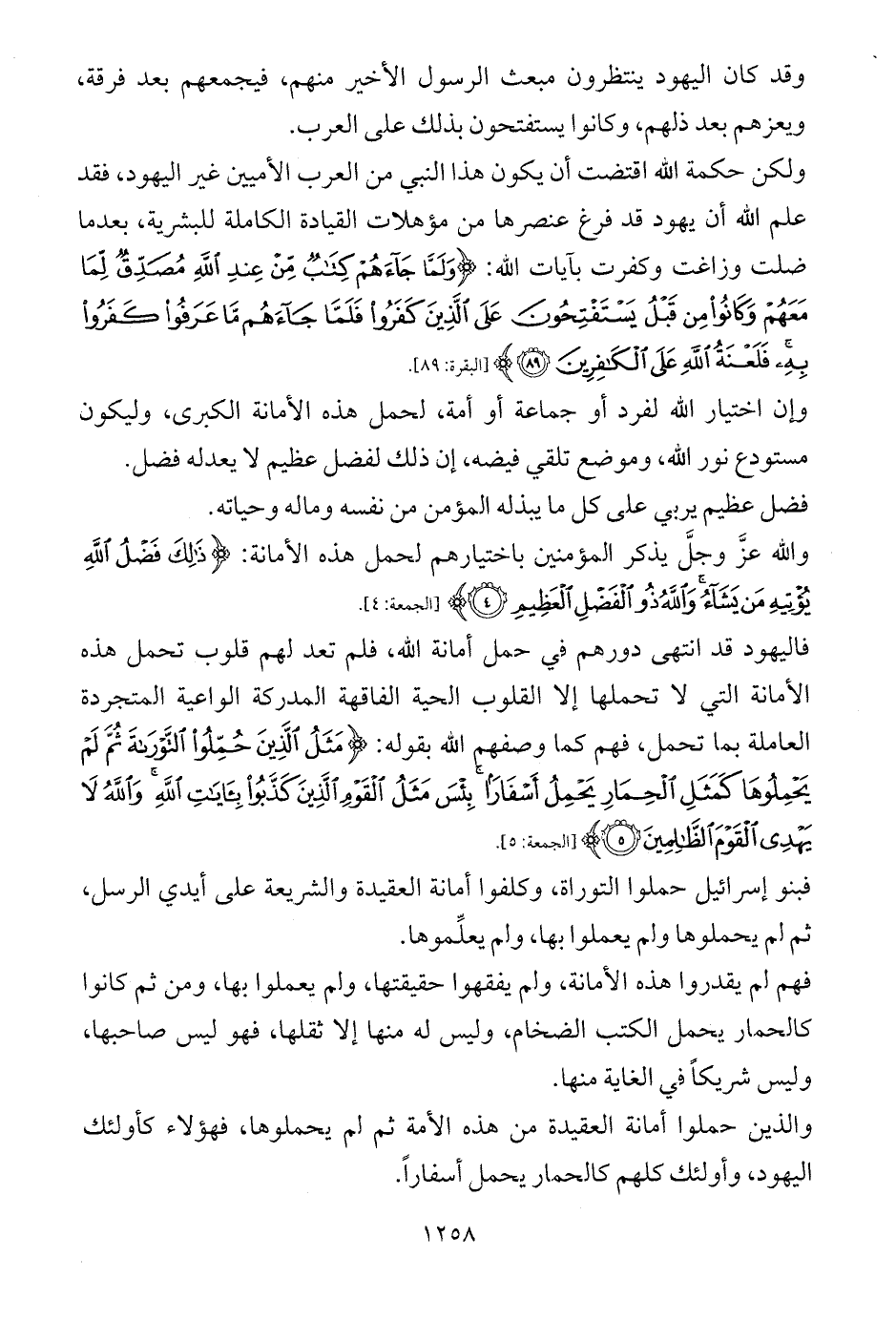والذين حملوا أمانة العقيدة من هذه الأمة ثم لم يحملوها، فهؤلاء كأولئك اليهود، وأولئك كلهم كالحمار يحمل أسفاراً.