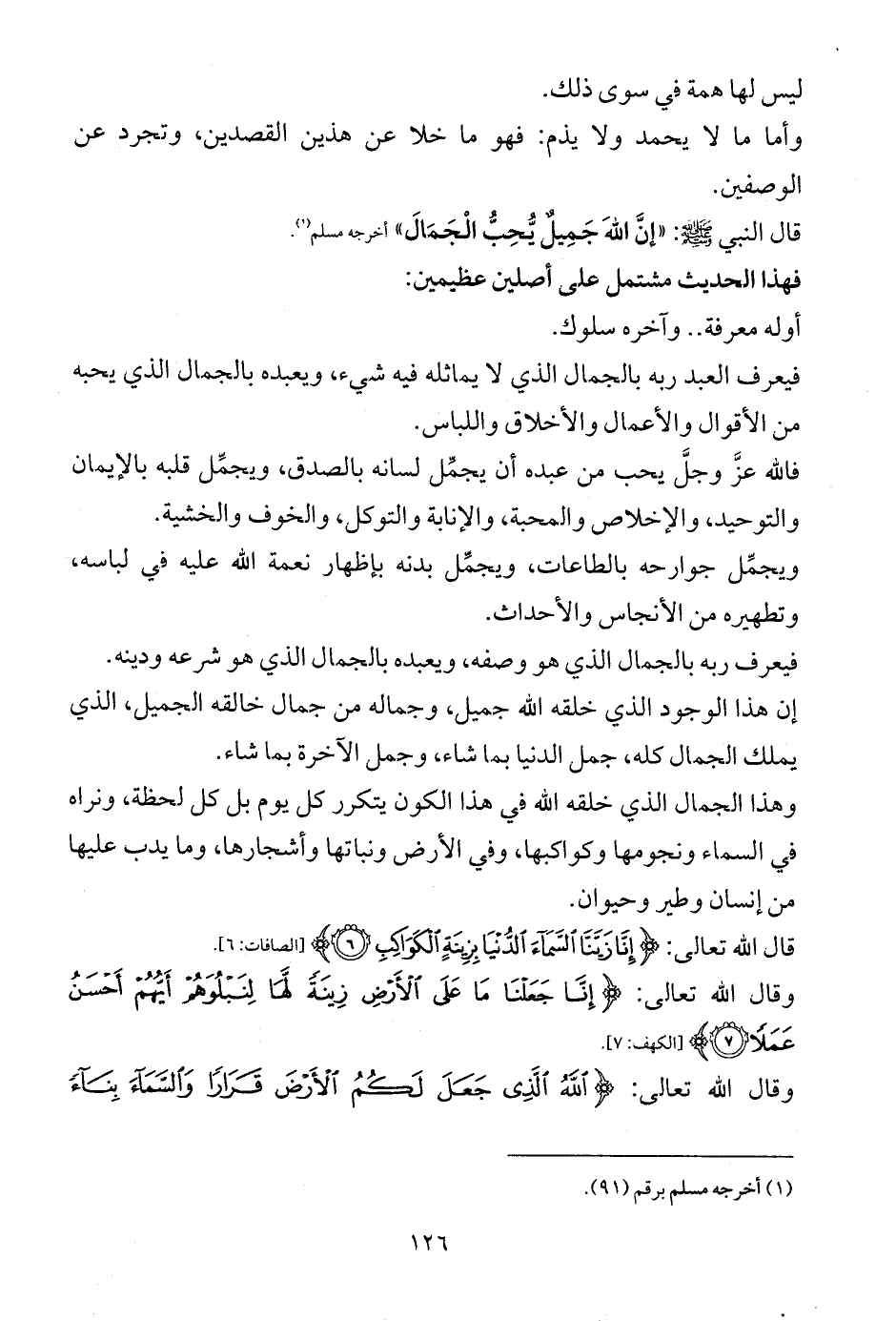 فيعرف العبد ربه بالجمال الذي لا يماثله فيه شيء، ويعبده بالجمال الذي يحبه من الأقوال والأعمال والأخلاق واللباس.