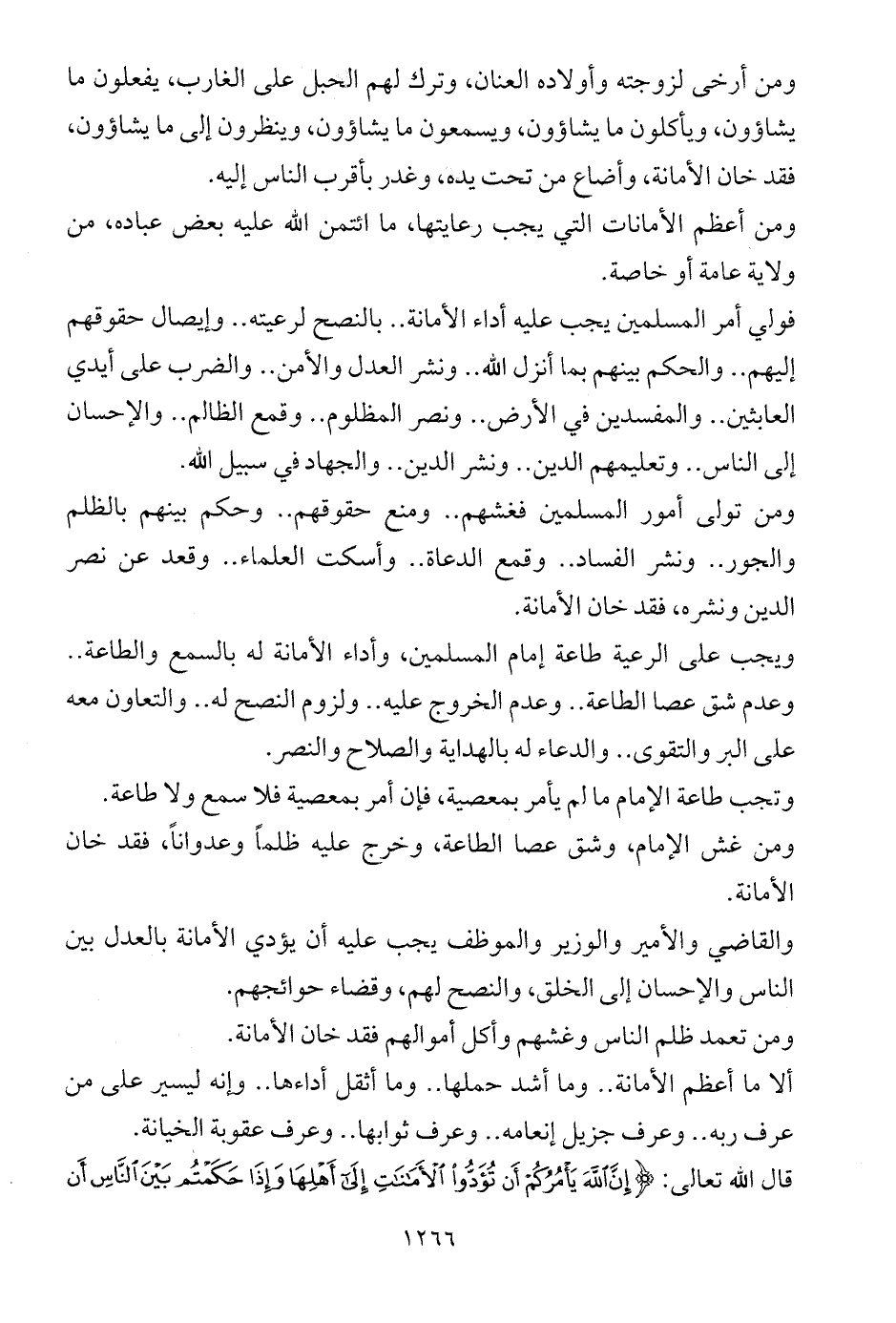 قال الله تعالى: {إِنَّ اللَّهَ يَأْمُرُكُمْ أَنْ تُؤَدُّوا الْأَمَانَاتِ إِلَى أَهْلِهَا وَإِذَا حَكَمْتُمْ بَيْنَ النَّاسِ أَنْ