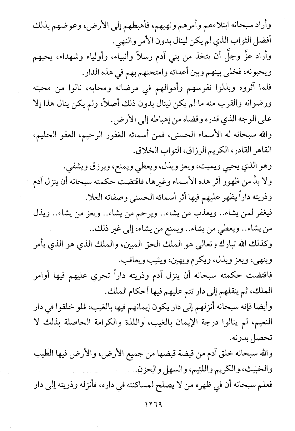 ولا بدَّ من ظهور أثر هذه الأسماء وغيرها، فاقتضت حكمته سبحانه أن ينزل آدم وذريته داراً يظهر عليهم فيها أثر أسمائه الحسنى وصفاته العلا.
