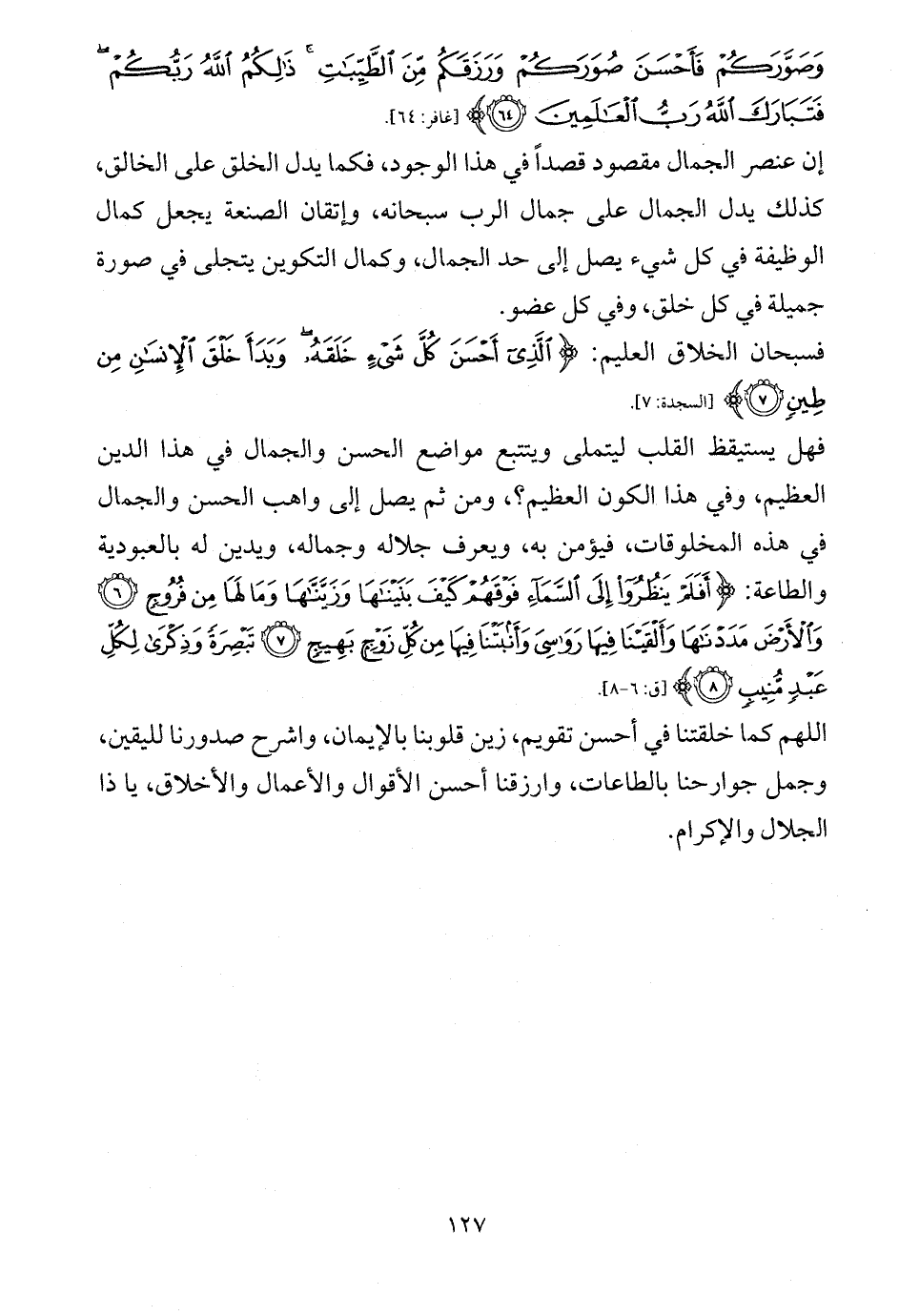 فهل يستيقظ القلب ليتملى ويتتبع مواضع الحسن والجمال في هذا الدين العظيم، وفي هذا الكون العظيم؟، ومن ثم يصل إلى واهب الحسن والجمال في هذه المخلوقات، فيؤمن به، ويعرف جلاله وجماله، ويدين له بالعبودية والطاعة: {أَفَلَمْ يَنْظُرُوا إِلَى السَّمَاءِ فَوْقَهُمْ كَيْفَ بَنَيْنَاهَا وَزَيَّنَّاهَا وَمَا لَهَا مِنْ فُرُوجٍ (6) وَالْأَرْضَ مَدَدْنَاهَا وَأَلْقَيْنَا فِيهَا رَوَاسِيَ وَأَنْبَتْنَا فِيهَا مِنْ كُلِّ زَوْجٍ بَهِيجٍ (7) تَبْصِرَةً وَذِكْرَى لِكُلِّ عَبْدٍ مُنِيبٍ (8)} [ق: 6 - 8].