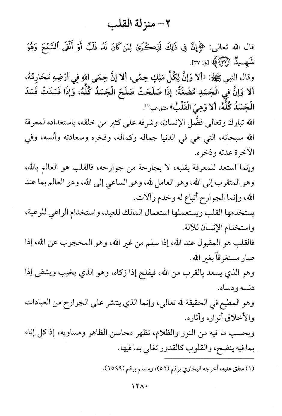 وقال النبي - صلى الله عليه وسلم -: «ألا وَإنَّ لِكُلِّ مَلِكٍ حِمًى، ألا إنَّ حِمَى اللهِ فِي أرْضِهِ مَحَارِمُهُ، ألا وَإنَّ فِي الْجَسَدِ مُضْغَةً: إذَا صَلَحَتْ صَلَحَ الْجَسَدُ كُلُّهُ، وَإذَا فَسَدَتْ فَسَدَ الْجَسَدُ كُلُّهُ، ألا وَهِيَ الْقَلْبُ» متفق عليه (¬1).