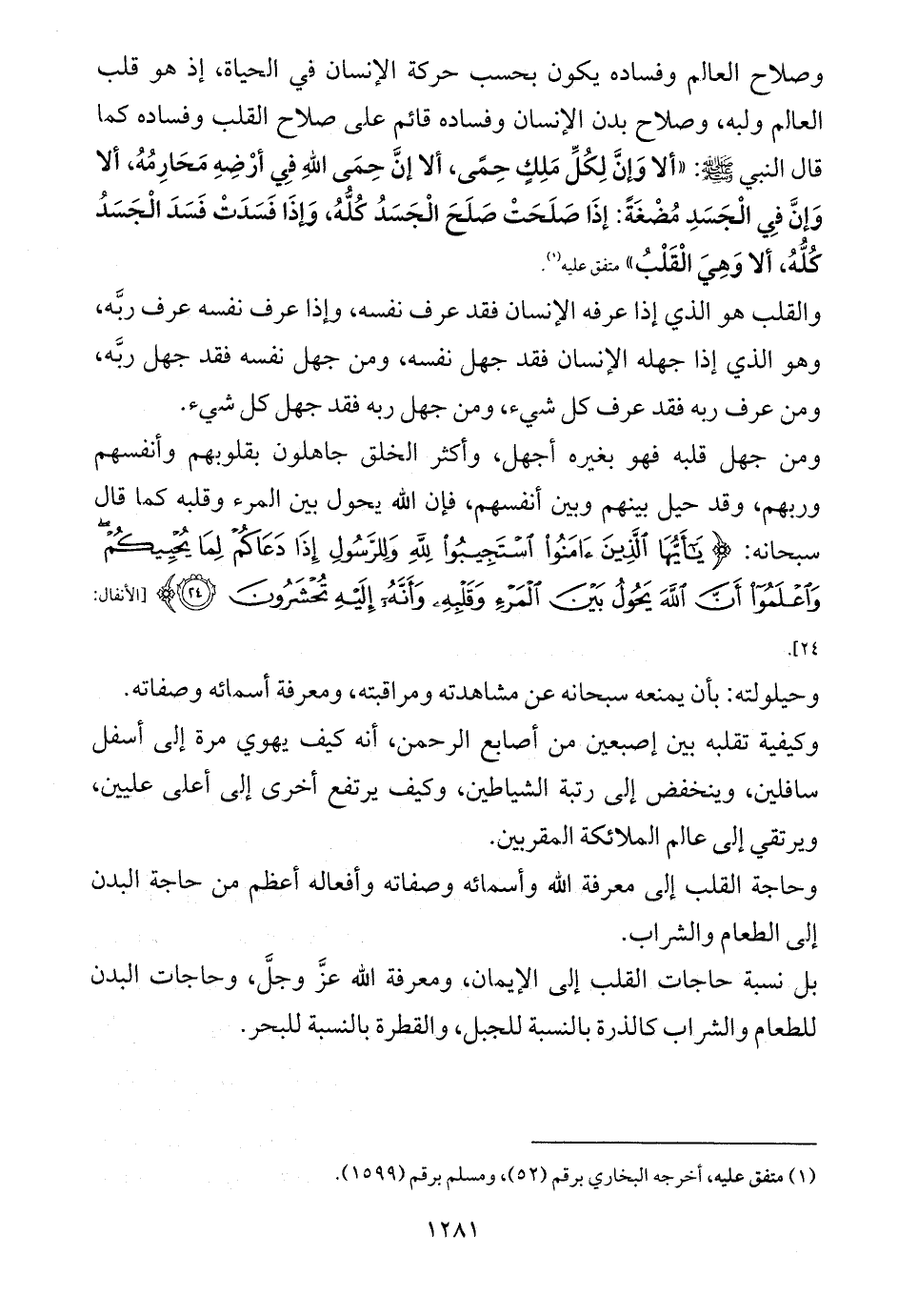 وصلاح العالم وفساده يكون بحسب حركة الإنسان في الحياة، إذ هو قلب العالم ولبه، وصلاح بدن الإنسان وفساده قائم على صلاح القلب وفساده كما قال النبي - صلى الله عليه وسلم -: «ألا وَإنَّ لِكُلِّ مَلِكٍ حِمًى، ألا إنَّ حِمَى اللهِ فِي أرْضِهِ مَحَارِمُهُ، ألا وَإنَّ فِي الْجَسَدِ مُضْغَةً: إذَا صَلَحَتْ صَلَحَ الْجَسَدُ كُلُّهُ، وَإذَا فَسَدَتْ فَسَدَ الْجَسَدُ كُلُّهُ، ألا وَهِيَ الْقَلْبُ» متفق عليه (¬1).
