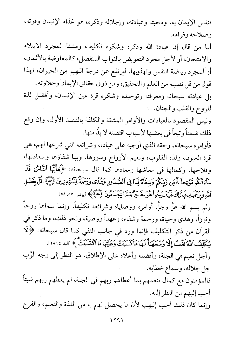 فنفس الإيمان به، ومحبته وعبادته، وإجلاله وذكره، هو غذاء الإنسان وقوته، وصلاحه وقوامه.