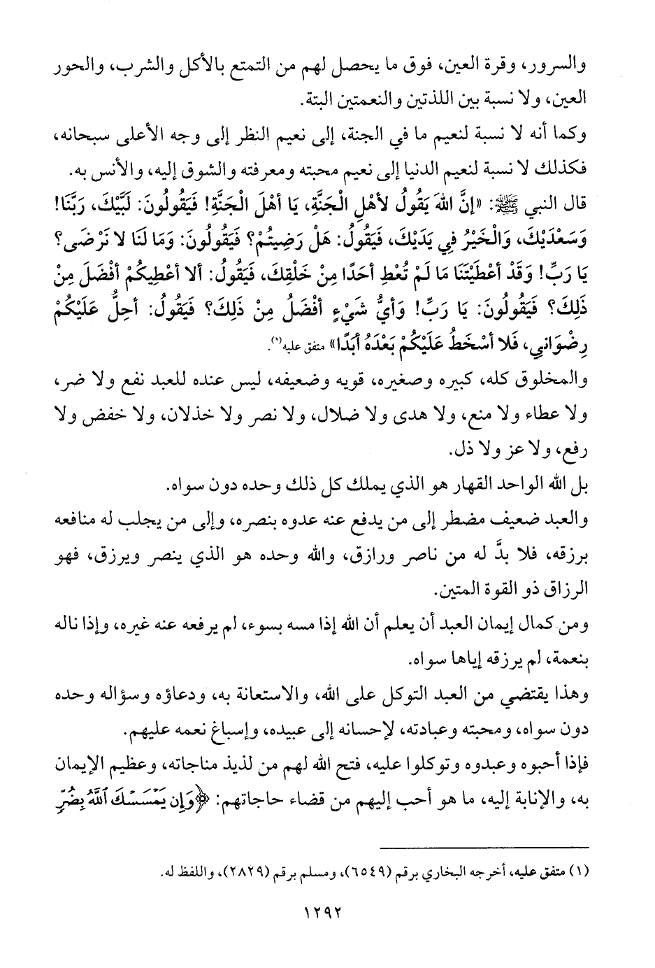 وهذا يقتضي من العبد التوكل على الله، والاستعانة به، ودعاؤه وسؤاله وحده دون سواه، ومحبته وعبادته، لإحسانه إلى عبيده، وإسباغ نعمه عليهم.