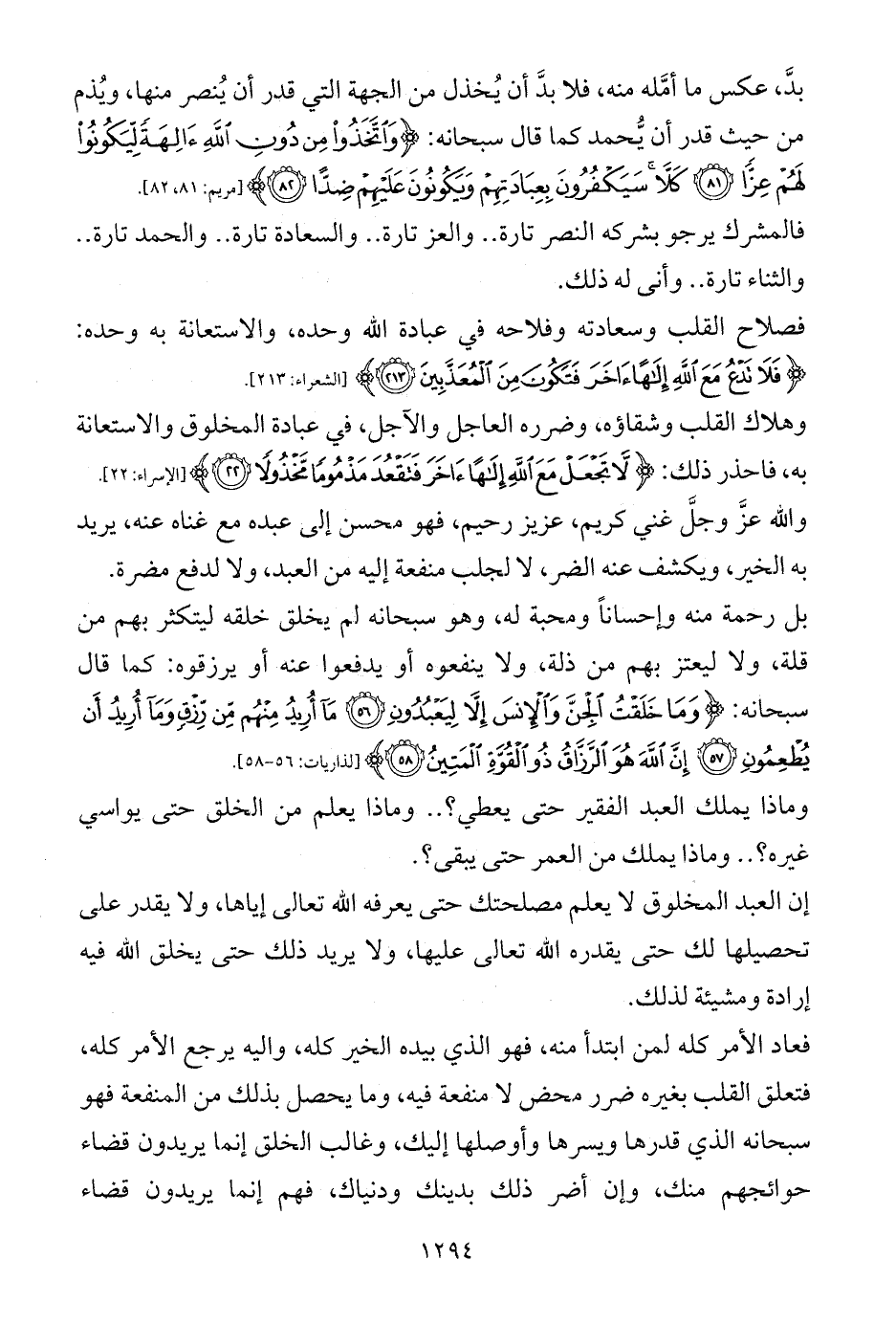 فعاد الأمر كله لمن ابتدأ منه، فهو الذي بيده الخير كله، واليه يرجع الأمر كله، فتعلق القلب بغيره ضرر محض لا منفعة فيه، وما يحصل بذلك من المنفعة فهو سبحانه الذي قدرها ويسرها وأوصلها إليك، وغالب الخلق إنما يريدون قضاء حوائجهم منك، وإن أضر ذلك بدينك ودنياك، فهم إنما يريدون قضاء
