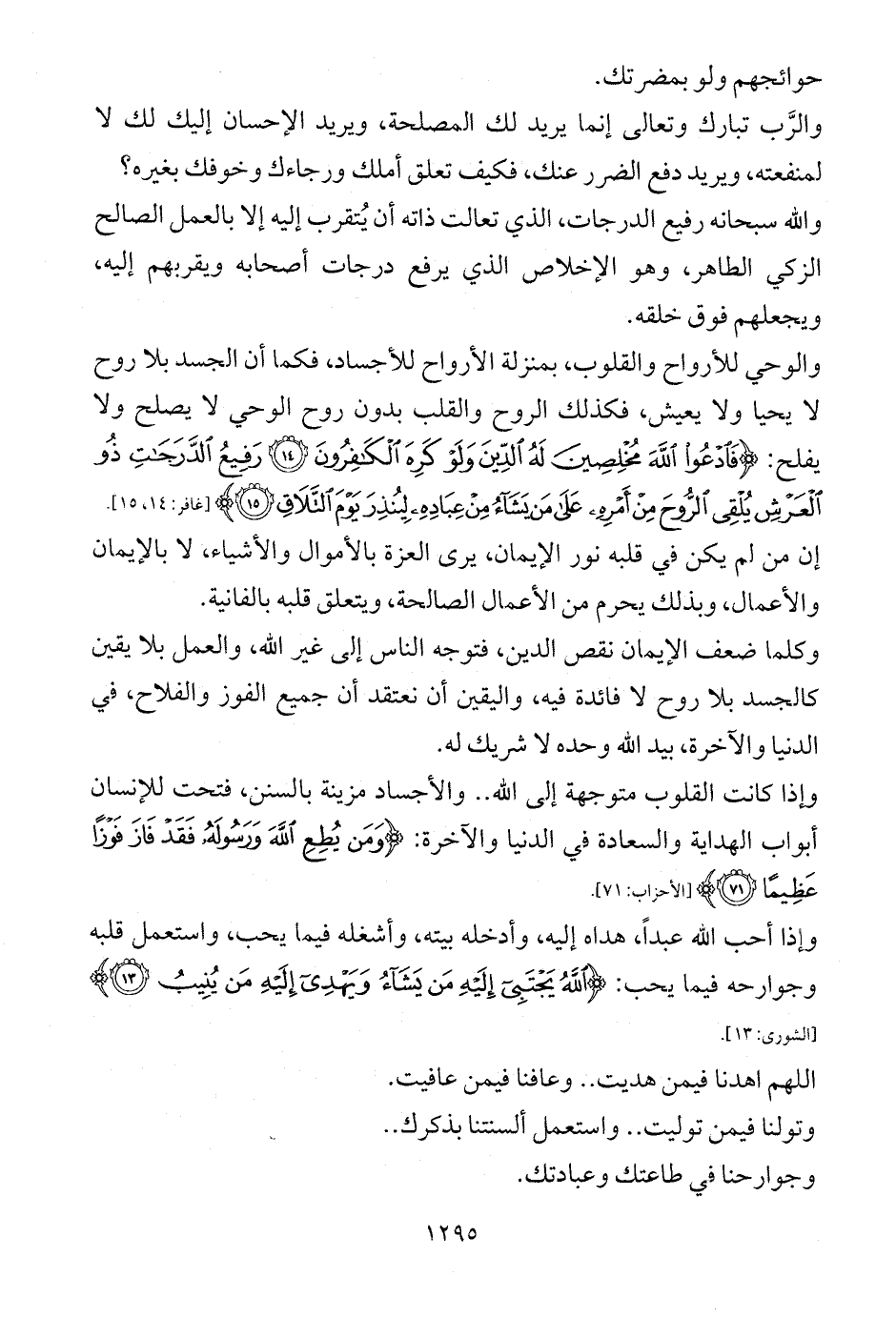 والوحي للأرواح والقلوب، بمنزلة الأرواح للأجساد، فكما أن الجسد بلا روح لا يحيا ولا يعيش، فكذلك الروح والقلب بدون روح الوحي لا يصلح ولا يفلح: {فَادْعُوا اللَّهَ مُخْلِصِينَ لَهُ الدِّينَ وَلَوْ كَرِهَ الْكَافِرُونَ (14) رَفِيعُ الدَّرَجَاتِ ذُو الْعَرْشِ يُلْقِي الرُّوحَ مِنْ أَمْرِهِ عَلَى مَنْ يَشَاءُ مِنْ عِبَادِهِ لِيُنْذِرَ يَوْمَ التَّلَاقِ (15)} [غافر: 14، 15].