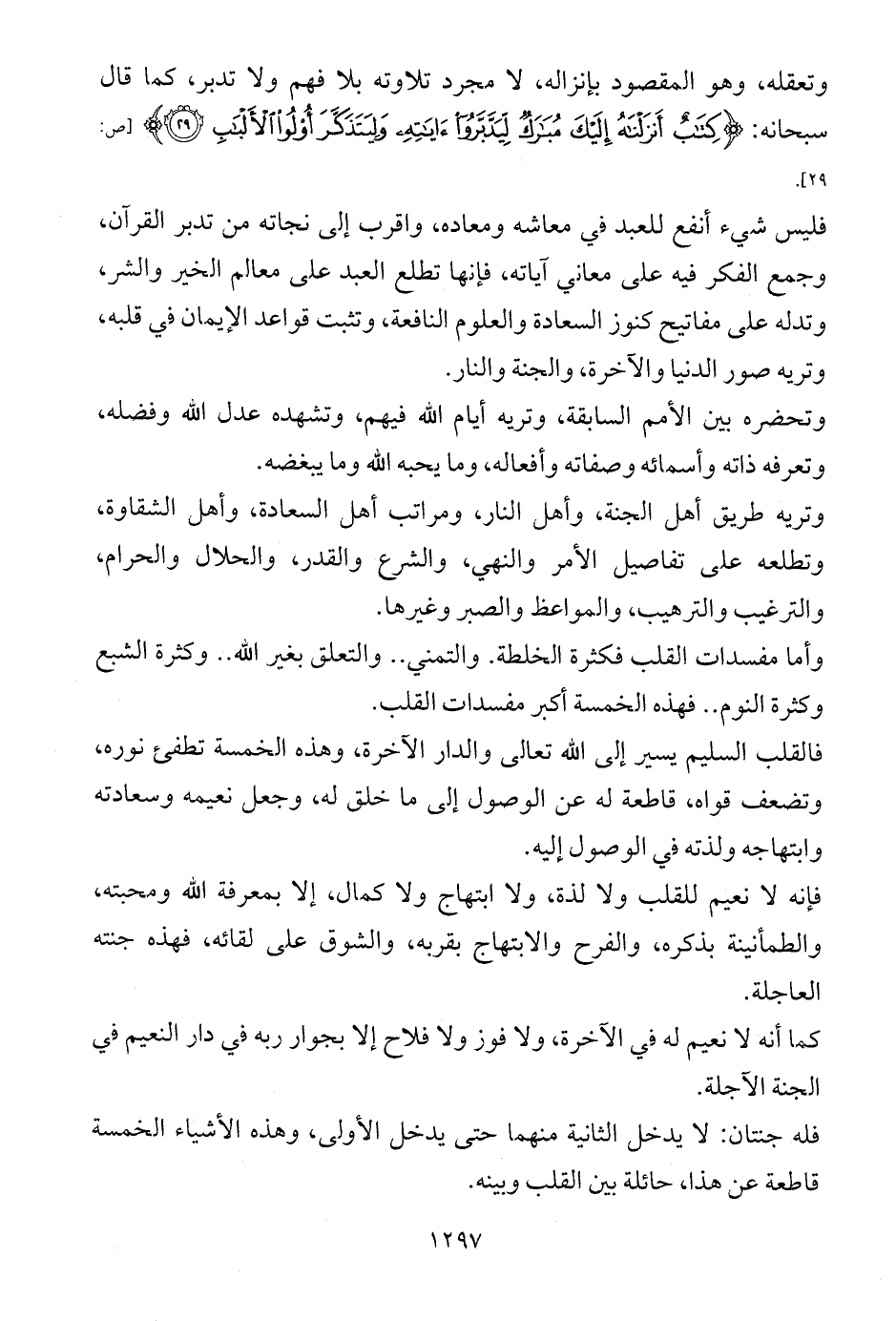 وتعقله، وهو المقصود بإنزاله، لا مجرد تلاوته بلا فهم ولا تدبر، كما قال سبحانه: {كِتَابٌ أَنْزَلْنَاهُ إِلَيْكَ مُبَارَكٌ لِيَدَّبَّرُوا آيَاتِهِ وَلِيَتَذَكَّرَ أُولُو الْأَلْبَابِ (29)} [ص: 29].
