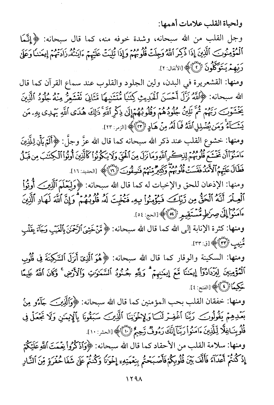 ومنها: خشوع القلب عند ذكر الله سبحانه كما قال الله عزَّ وجلَّ: {أَلَمْ يَأْنِ لِلَّذِينَ آمَنُوا أَنْ تَخْشَعَ قُلُوبُهُمْ لِذِكْرِ اللَّهِ وَمَا نَزَلَ مِنَ الْحَقِّ وَلَا يَكُونُوا كَالَّذِينَ أُوتُوا الْكِتَابَ مِنْ قَبْلُ فَطَالَ عَلَيْهِمُ الْأَمَدُ فَقَسَتْ قُلُوبُهُمْ وَكَثِيرٌ مِنْهُمْ فَاسِقُونَ (16)} [الحديد: 16].